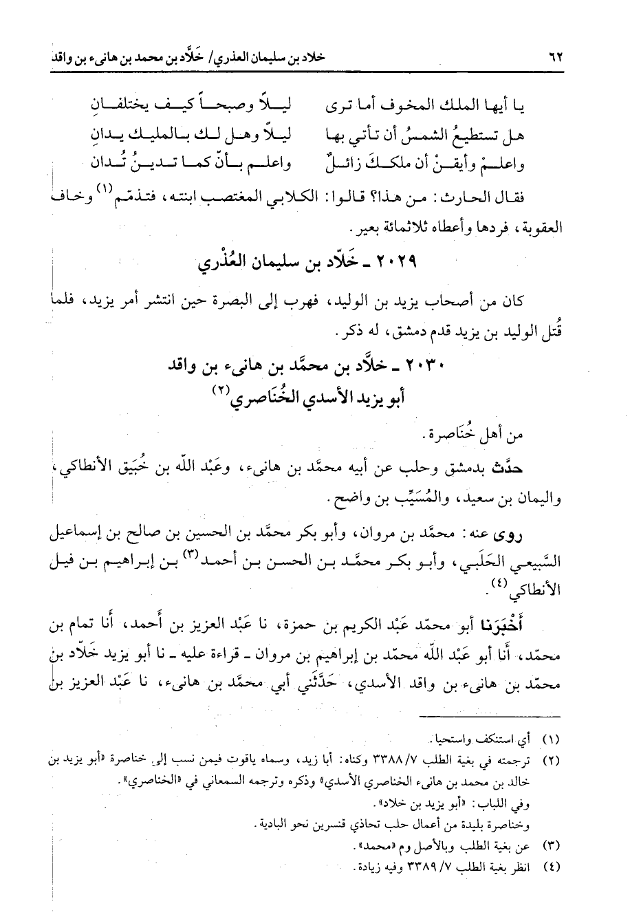 (2) ترجمته في بغية الطلب 7 / 3388 وكناه: أبا زيد وسماه ياقوت فيمن نسب إلى خناصرة " أبو يزيد بن خالد بن محمد بن هانئ الخناصري الاسدي وذكره وترجمه السمعاني في " الخناصري "