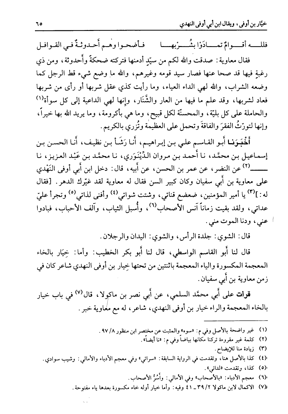 فلله أقوام تمادوا بشربها * فأضحوا وهم أحدوثة في القوافل * فقال معاوية صدقت والله لكم من سيد أدمنها فتركته ضحكة وأحدوثة ومن ذي رغبة فيها قد صحا عنها فصار سيد قومه وغيرهم والله ما وضع شئ قط الرجل كما وضعه الشراب والله لهي الداء العياء وما رأيت كذي عقل شربها أو رأى من شربها فعاد لشربها وقد علم ما فيها من العار والشنار وإنها لهي الداعية إلى كل سوأة (1) والحاملة على كل بلية والمحسنة لكل قبيح وما هي بأكرومة وما يريد الله بها خيرا وإنها لتورث الفقر والفاقة وتحمل على العظيمة وتزري بالكريم أخبرنا أبو القاسم علي بن إبراهيم أنا رشأ بن نظيف أنا الحسن بن إسماعيل بن محمد نا أحمد بن مروان الدينوري نا محمد بن عبد العزيز نا (2) عن النضر عن عمر بن الحسن عن أبيه قال دخل ابن أبي أوفى النهدي على معاوية بن أبي سفيان وكان كبير السن فقال له معاوية لقد غيرك الدهر فقال له (3) يا أمير المؤمنين ضعضع قناتي وشتت شواتي (4) وأفنى لذاتي (5) وتجرأ علي عداتي ولقد بقيت زمانا آنس الأصحاب (6) وأسبل الثياب وآلف الأحباب فبادوا عني ودنا الموت مني قال الشوي جلدة الرأس والشوي اليدان والرجلان قال لنا أبو القاسم الواسطي قال لنا أبو بكر الخطيب وأما خيار بالخاء المعجمة المكسورة والياء المعجمة باثنتين من تحتها خيار بن أوفى النهدي شاعر كان في زمن معاوية بن أبي سفيان قرأت على أبي محمد السلمي عن أبي نصر بن ماكولا قال (7) في باب خيار بالخاء المعجمة والراء خيار بن أوفى النهدي شاعر له مع معاوية خبر