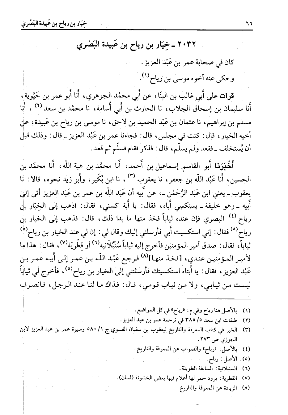 2032 - خيار بن رياح بن عبيدة البصري كان في صحابة عمر بن عبد العزيز وحكى عنه أخوه موسى بن رياح (1) قرأت على أبي غالب بن البنا عن أبي محمد الجوهري أنا أبو عمر بن حيوية أنا سليمان بن إسحاق الجلاب نا الحارث بن أبي أسامة نا محمد بن سعد (2) أنا مسلم بن إبراهيم نا عثمان بن عبد الحميد بن لاحق نا موسى بن رياح بن عبيدة عن أخيه الخيار قال كنت في مجلس قال فجاءنا عمر بن عبد العزيز قال وذلك قبل أن يستخلف فقعد ولم يسلم قال فذكر فقام فسلم ثم قعد أخبرنا أبو القاسم إسماعيل بن أحمد أنا محمد بن هبة الله أنا محمد بن الحسين أنا عبد الله بن جعفر نا يعقوب (3) نا ابن بكير وأبو زيد نحوه قالا نا يعقوب يعني ابن عبد الرحمن عن أبيه أن عبد الله بن عمر بن عبد العزيز أتى إلى أبيه وهو خليفة يستكسي أباه فقال يا أبة اكسني فقال اذهب إلى الخيار بن رياح (4) البصري فإن عنده ثيابا فخذ منها ما بدا ذلك قال فذهب إلى الخيار بن رياح (5) فقال إني استكسيت أبي فأرسلني إليك وقال لي إن لي عند الخيار بن رياح (5) ثيابا فقال صدق أمير المؤمنين فأخرج إليه ثيابا سنبلانية (6) أو قطرية (7) فقال هذا ما لأمير المؤمنين عندي فخذ منها (8) فرجع عبد الله بن عمر إلى أبيه عمر بن عبد العزيز فقال يا أبتاه استكسيتك فأرسلتني إلى الخيار بن رياح (5) فأخرج لي ثيابا ليست من ثيابي ولا من ثياب قومي قال فذاك ما لنا عند الرجل فانصرف
