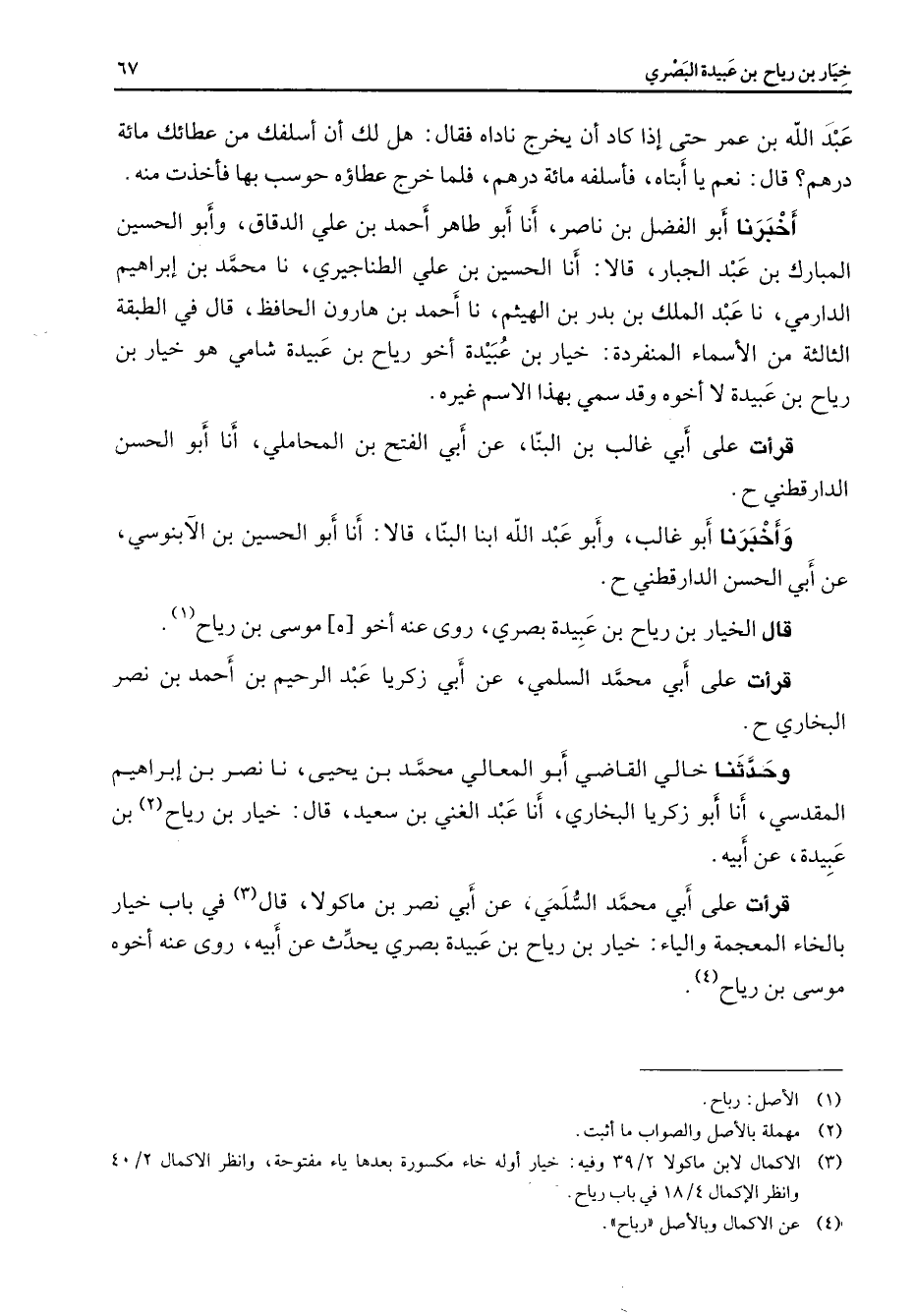 عبد الله بن عمر حتى إذا كاد أن يخرج ناداه فقال هل لك أن أسلفك من عطائك مائة درهم قال نعم يا أبتاه فأسلفه مائة درهم فلما خرج عطاؤه حوسب بها فأخذت منه أخبرنا أبو الفضل بن ناصر أنا أبو طاهر أحمد بن علي الدقاق وأبو الحسين المبارك بن عبد الجبار قالا أنا الحسين بن علي الطناجيري نا محمد بن إبراهيم الدارمي نا عبد الملك بن بدر بن الهيثم نا أحمد بن هارون الحافظ قال في الطبقة الثالثة من الأسماء المنفردة خيار بن عبيدة أخو رياح بن عبيدة شامي هو خيار بن رياح بن عبيدة لا أخوه وقد سمي بهذا الاسم غيره قرأت على أبي غالب بن البنا عن أبي الفتح بن المحاملي أنا أبو الحسن الدارقطني وأخبرنا أبو غالب وأبو عبد الله ابنا البنا قالا أنا أبو الحسين بن الآبنوسي عن أبي الحسن الدارقطني قال الخيار بن رياح بن عبيدة بصري روى عنه أخوه موسى بن رياح (1) قرأت على أبي محمد السلمي عن أبي زكريا عبد الرحيم بن أحمد بن نصر البخاري وحدثنا خالي القاضي أبو المعالي محمد بن يحيى نا نصر بن إبراهيم المقدسي أنا أبو زكريا البخاري أنا عبد الغني بن سعيد قال خيار بن رياح (2) بن عبيده عن أبيه قرأت علي أبي محمد السلمي عن أبي نصر بن ماكولا قال (3) في باب خيار بالخاء المعجمة والياء خيار بن رياح بن عبيدة بصري يحدث عن أبيه روى عنه أخوه موسى بن رياح (4)