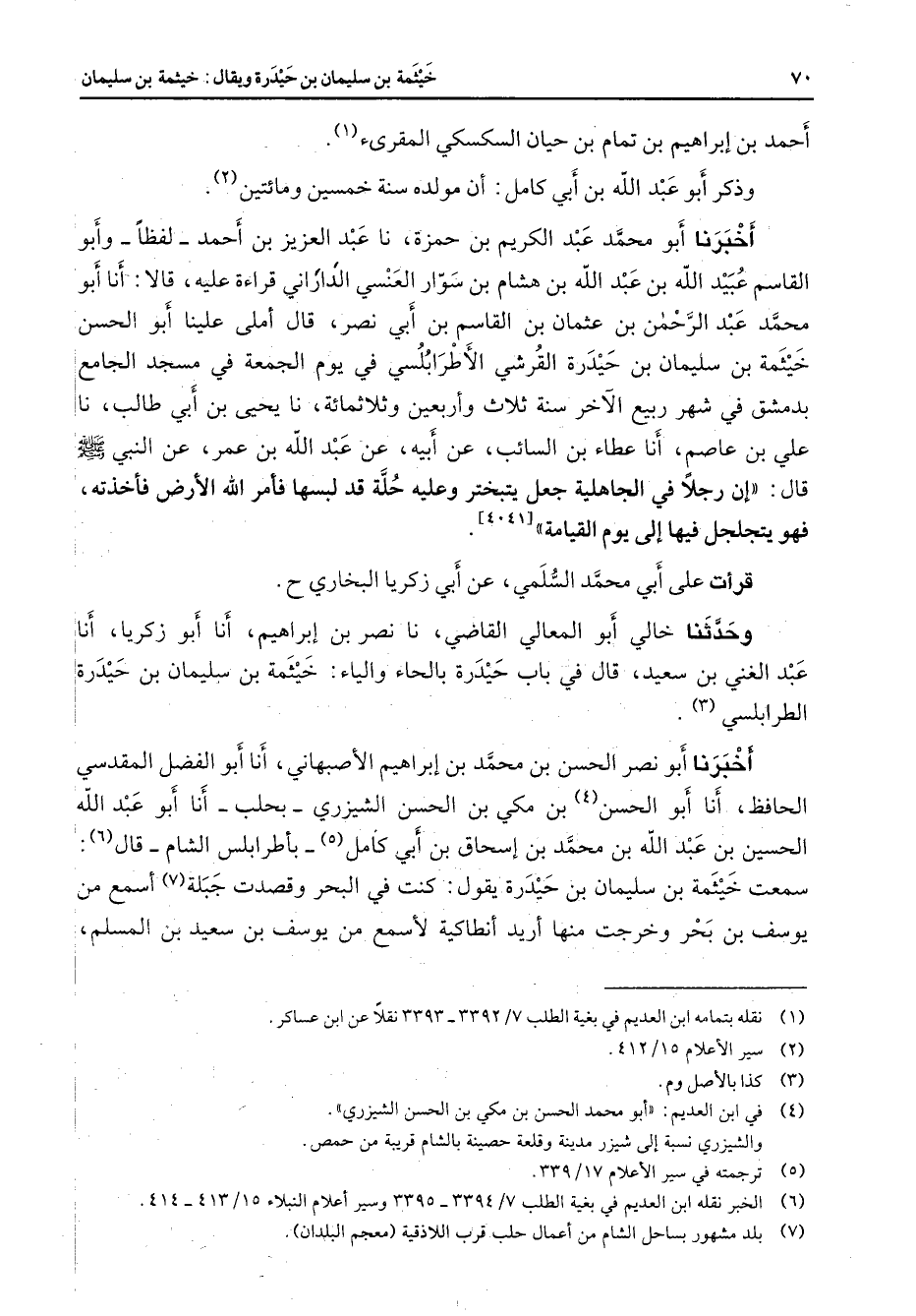 أحمد بن إبراهيم بن تمام بن حيان السكسكي المقرئ (1) وذكر أبو عبد الله بن أبي كامل أن مولده سنة خمسين ومائتين (2) أخبرنا أبو محمد عبد الكريم بن حمزة نا عبد العزيز بن أحمد لفظا وأبو القاسم عبيد الله بن عبد الله بن هشام بن سوار العنسي الداراني قراءة عليه قالا أنا أبو محمد عبد الرحمن بن عثمان بن القاسم بن أبي نصر قال أملى علينا أبو الحسن خيثمة بن سليما بن حيدرة القرشي الأطرابلسي في يوم الجمعة في مسجد الجامع بدمشق في شهر ربيع الآخر سنة ثلاث وأربعين وثلاثمائة نا يحيى بن أبي طالب نا علي بن عاصم أنا عطاء بن السائب عن أبيه عن عبد الله بن عمر عن النبي (صلى الله عليه وسلم) قال إن رجلا في الجاهلية جعل يتبختر وعليه حلة قد لبسها فأمر الله الأرض فأخذته فهل يتجلجل فيها إلى يوم القيامة قرأت على أبي محمد السلمي عن أبي زكريا البخاري وحدثنا خالي أبو المعالي القاضي نا نصر بن إبراهيم أنا أبو زكريا أنا عبد الغني بن سعيد قال في باب حيدرة بالحاء والياء خيثمة بن سليمان بن حيدرة الطرابلسي (3) أخبرنا أبو نصر الحسن بن محمد بن إبراهيم الأصبهاني أنا أبو الفضل المقدسي الحافظ أنا أبو الحسن (4) بن مكي بن الحسن الشيزري بحلب أنا أبو عبد الله الحسين بن عبد الله بن محمد بن إسحاق بن أبي كامل (5) بأطرابلس الشام قال (6) سمعت خيثمة بن سليمان بن حيدرة يقول كنت في البحر وقصدت جبلة (7) أسمع من يوسف بن بحر وخرجت منها أريد أنطاكية لأسمع من يوسف بن سعيد بن المسلم