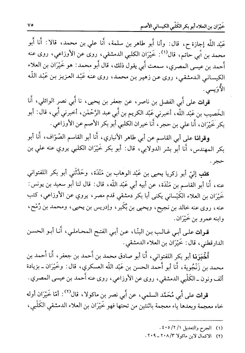 عبد الله إجازة قال وأنا أبو طاهر بن سلمة أنا علي بن محمد قالا أنا أبو محمد بن أبي حاتم قال (1) خيران الكلبي الدمشقي روى عن الأوزاعي روى عنه أحمد بن عيسى المصري سمعت أبي يقول ذلك قال أبو محمد هو خيران بن العلاء الكيساني الدمشقي روى عن زهير بن محمد روى عنه عبد العزيز بن عبد الله الأويسي قرأت على أبي الفضل بن ناصر عن جعفر بن يحيى نا أبي نصر الوائلي أنا الخصيب بن عبد الله أخبرني عبد الكريم بن أبي عبد الرحمن أخبرني أبي قال أبو بكر خيران أنا علي بن حجر أنا خيران الكلبي أبو بكر الأصم عن الأوزاعي وقرأنا على أبي القاسم عن أبي طاهر الأنباري أنا أبو القاسم الصواف أنا أبو بكر المهندس أنا أبو بشر الدولابي قال أبو بكر خيران الكلبي يروي عنه علي بن حجر كتب إلي أبو زكريا يحيى بن عبد الوهاب بن مندة وحدثني أبو بكر اللفتواني عنه أنا أبو القاسم بن مندة عن أبيه أبي عبد الله قال قال لنا أبو سعيد بن يونس خيران بن العلاء الكيساني يكنى أبا بكر الدمشقي قدم مصر يروى عن الأوزاعي كتب عنه روى عنهخالد بن نجيح ويحيى بن بكير وإدريس بن يحيى ومحمد بن رمح وابنه عمرو بن خيران قرأت على أبي غالب بن البنا عن أبي الفتح المحاملي أنا أبو الحسن الدارقطني قال خيران بن العلاء الدمشقي أخبرنا أبو بكر اللفتواني أنا أبو صادق محمد بن أحمد بن جعفر أنا أحمد بن محمد بن زنجوية أنا أبو أحمد الحسن بن عبد الله العسكري قال وخيران بزيادة ألف ونون الكلبي الدمشقي روى عن الأوزاعي روى عنه أحمد بن عيسى المصري قرأت على أبي محمد السلمي عن أبي نصر بن ماكولا قال (2) أما خيران أوله خاء معجمة وبعدها ياء معجمة باثنتين من تحتها فهو خيران بن العلاء الدمشقي الكلبي
