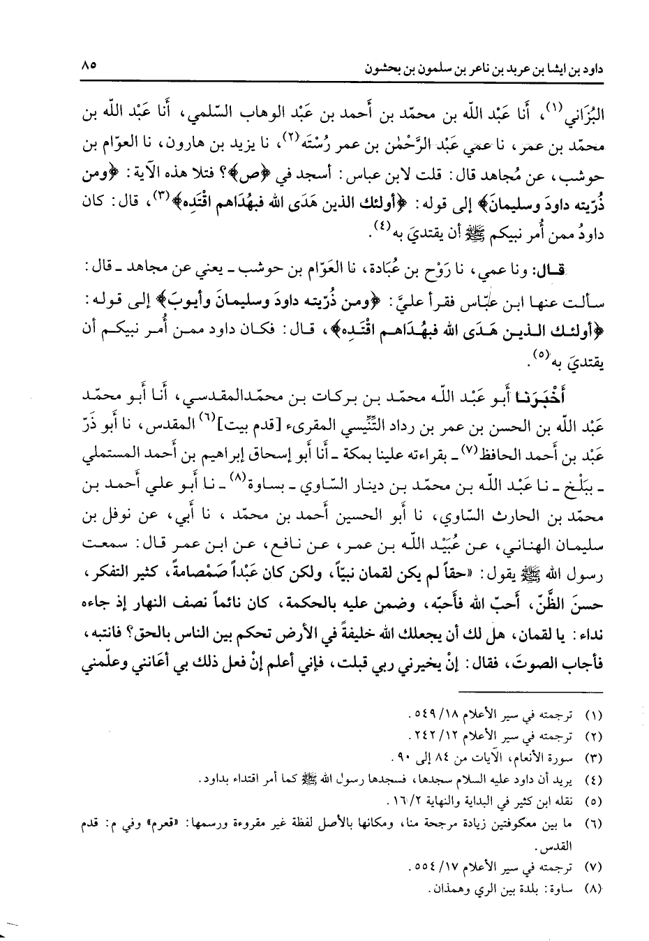 البزاني (1) أنا عبد الله بن محمد بن أحمد بن عبد الوهاب السلمي أنا عبد الله بن محمد بن عمر نا عمي عبد الرحمن بن عمر رسته (2) نا يزيد بن هارون نا العوام بن حوشب عن مجاهد قال قلت لابن عباس أسجد في " ص " فتلا هذه الآية " ومن ذريته داود وسليمان " إلى قوله " أولئك الذين هدى الله فبهداهم اقتده " (3) قال كان داود ممن أمر نبيكم (صلى الله عليه وسلم) أن يقتدى به (4) قال ونا عمي نا روح بن عبادة نا العوام بن حوشب يعني عن مجاهد قال سألت عنها ابن عباس فقرأ علي " ومن ذريته داود وسليمان وأيوب " إلى قوله " أولئك الذين هدى الله فبهداهم اقتده " قال فكان داود ممن أمر نبيكم أن يقتدي به (5) أخبرنا أبو عبد الله محمد بن بركات بن محمد المقدسي أنا أبو محمد عبد الله بن الحسن بن عمر بن رداد التنيسي المقرئ قدم بيت (6) المقدس نا أبو ذر عبد بن أحمد الحافظ (7) بقراءته علينا بمكة أنا أبو إسحاق إبراهيم بن أحمد المستملي ببلخ نا عبد الله بن محمد بن دينار الساوي بساوة (8) نا أبو علي أحمد بن محمد بن الحارث الساوي نا أبو الحسين أحمد بن محمد نا أبي عن نوفل بن سليمان الهناني عن عبيد الله بن عمر عن نافع عن ابن عمر قال سمعت رسول الله (صلى الله عليه وسلم) يقول حقا لم يكن لقمان نبيا ولكن كان عبدا صمصامة كثير التفكر حسن الظن أحب الله فأحبه وضمن عليه بالحكمة كان نائما نصف النهار إذ جاءه نداء يا لقمان هل لك أن يجعلك الله خليفة في الأرض تحكم بين الناس بالحق فانتبه فأجاب الصوت فقال إن يخيرني ربي قبلت فإني أعلم إن فعل ذلك بي أعانني وعلمني