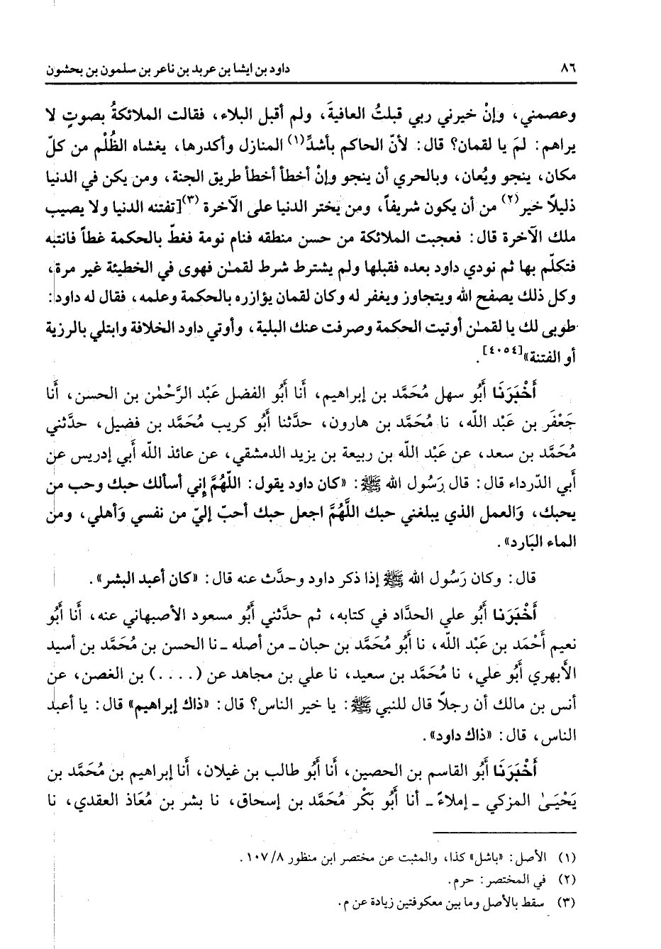 وعصمني وإن خيرني ربي قبلت العافية ولم أقبل البلاء فقالت الملائكة بصوت لا يراهم لم يا لقمان قال لأن الحاكم بأشد (1) المنازل وأكدرها يغشاه الظلم من كل مكان ينجو ويعان وبالحري أن ينجو وإن اخطأ أخطأ طريق الجنة ومن يكن في الدنيا ذليلا خير (2) من أن يكون شريفا ومن يختر الدنيا على الآخرة (3) تفتنه الدنيا ولا يصيب ملك الآخرة قال فعجبت الملائكة من حسن منطقه فنام نومة فغط بالحكمة غطا فانتبه فتكلم بها ثم نودي داود بعده فقبلها ولم يشترط شرط لقمان فهوى في الخطيئة غير مرة وكل ذلك يصفح الله ويتجاوز ويغفر له وكان لقمان يؤازره بالحكمة وعلمه فقال له داود طوبى لك يا لقمان أوتيت الحكمة وصرفت عنك البلية وأوتي داود الخلافة وابتلي بالرزية أو الفتنة أخبرنا أبو سهل محمد بن إبراهيم أنا أبو الفضل عبد الرحمن بن الحسن أنا جعفر بن عبد الله نا محمد بن هارون حدثنا أبو كريب محمد بن فضيل حدثني محمد بن سعد عن عبد الله بن ربيعة بن يزيد الدمشقي عن عائذ الله أبي إدريس عن أبي الدرداء قال قال رسول الله (صلى الله عليه وسلم) كان داود يقول اللهم إني أسألك حبك وحب من يحبك والعمل الذي يبلغني حبك اللهم اجعل حبك أحب إلي من نفسي وأهلي ومن الماء البارد قال وكان رسول الله (صلى الله عليه وسلم) إذا ذكر داود وحدث عنه قال كان أعبد البشر أخبرنا أبو علي الحداد في كتابه ثم حدثني أبو مسعود الأصبهاني عنه أنا أبو نعيم أحمد بن عبد الله نا أبو محمد بن حبان من أصله نا الحسن بن محمد بن أسيد الأبهري أبو علي نا محمد بن سعيد نا علي بن مجاهد عن بن الغصن عن أنس بن مالك أن رجلا قال للنبي (صلى الله عليه وسلم) يا خير الناس قال ذاك إبراهيم قال يا أعبد الناس قال ذاك داود أخبرنا أبو القاسم بن الحصين أنا أبو طالب بن غيلان أنا إبراهيم بن محمد بن يحيى المزكي ملاء أنا أبو بكر محمد بن إسحاق نا بشر بن معاذ العقدي نا