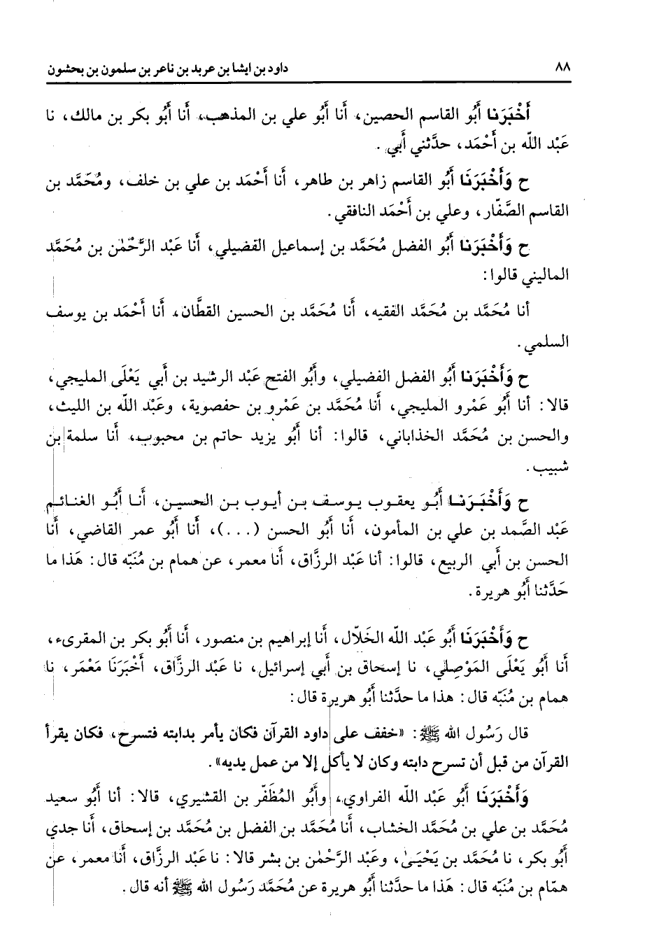 أخبرنا أبو القاسم الحصين أنا أبو علي بن المذهب أنا أبو بكر بن مالك نا عبد الله بن أحمد حدثني أبي ح وأخبرنا أبو القاسم زاهر بن طاهر أنا أحمد بن علي بن خلف ومحمد بن القاسم الصفار وعلي بن أحمد النافقي ح وأخبرنا أبو الفضل محمد بن إسماعيل الفضيلي أنا عبد الرحمن بن محمد الماليني قالوا أنا محمد بن محمد الفقيه أنا محمد بن الحسين القطان أنا أحمد بن يوسف السلمي ح وأخبرنا أبو الفضل الفضيلي وأبو الفتح عبد الرشيد بن أبي يعلى المليجي قالا أنا أبو عمرو المليجي أنا محمد بن عمرو بن حفصوية وعبد الله بن الليث والحسن بن محمد الخذاباني قالوا أنا أبو يزيد حاتم بن محبوب أنا سلمة بن شبيب ح وأخبرنا أبو يعقوب يوسف بن أيوب بن الحسين أنا أبو الغنائم عبد الصمد بن علي بن المأمون أنا أبو الحسن 000 أنا أبو عمر القاضي أنا الحسن بن أبي ربيع قالوا أنا عبد الرزاق أنا معمر عن همام بن منبه قال هذا ما حدثنا أبو هريرة ح وأخبرنا أبو عبد الله الخلال أنا إبراهيم بن منصور أنا أبو بكر المقرئ أنا أبو يعلى الموصلي نا إسحاق بن أبي إسرائيل نا عبد الرزاق أخبرنا معمر نا همام بن منبه قال هذا ما حدثنا أبو هريرة قال قال رسول الله (صلى الله عليه وسلم) خفف على داود القرآن فكان يأمر بدابته فتسرح فكان يقرأ القرآن من قبل أن تسرح دابته وكان لا يأكل إلا من عمل يديه وأخبرنا أبو عبد الله الفراوي وأبو المظفر بن القشيري قالا أنا أبو سعيد محمد بن علي بن محمد الخشاب أنا محمد بن الفضل بن محمد بن إسحاق أنا جدي أبو بكر نا محمد بن يحيى وعبد الرحمن بن بشر قالا نا عبد الرزاق أنا معمر عن همام بن منبه قال هذا ما حدثنا أبو هريرة عن محمد رسول الله (صلى الله عليه وسلم) أنه قال
