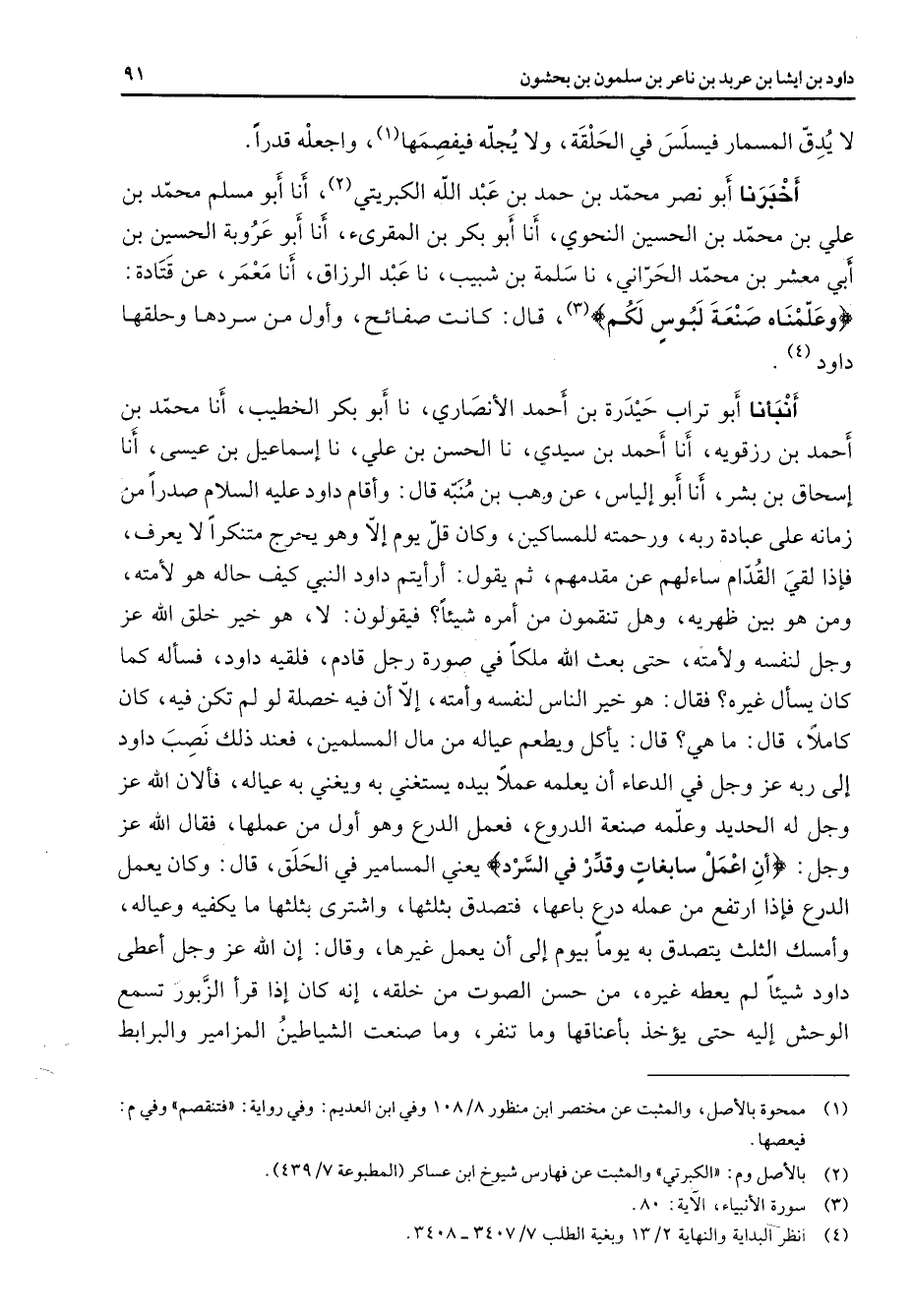 لا يدق المسمار فيسلس في الحلقة ولا يجله فيفصمها (1) واجعله قدرا أخبرنا أبو نصر محمد بن حمد بن عبد الله الكبريتي (2) أنا أبو مسلم محمد بن علي بن محمد بن الحسين النحوي أنا أبو بكر بن المقرئ أنا أبو عروبة الحسين بن أبي معشر بن محمد الحراني نا سلمة بن شبيب نا عبد الرزاق أنا معمر عن قتادة " وعلمناه صنعة لبوس لكم " (3) قال كانت صفائح وأول من سردها وحلقها داود (4) أنبأنا أبو تراب حيدرة بن أحمد الأنصاري نا أبو بكر الخطيب أنا محمد بن أحمد بن رزقويه أنا أحمد بن سيدي نا الحسن بن علي نا إسماعيل بن عيسى أنا إسحاق بن بشر أنا أبو إلياس عن وهب بن منبه قال وأقام داود عليه السلام صدرا من زمانه على عبادة ربه ورحمته للمساكين وكان قل يوم إلا وهو يخرج متنكرا لا يعرف فإذا لقي القدام ساءلهم عن مقدمهم ثم يقول أرأيتم داود النبي كيف حاله هو لأمته ومن هو بين ظهريه وهل تنقمون من أمره شيئا فيقولون لا هو خير خلق الله عز وجل لنفسه ولأمته حتى بعث الله ملكا في صورة رجل قادم فلقيه داود فسأله كما كان يسأل غيره فقال هو خير الناس لنفسه وأمته إلا أن فيه خصلة لو لم تكن فيه كان كاملا قال ما هي قال يأكل ويطعم عياله من مال المسلمين فعند ذلك نصب داود إلى ربه عز وجل في الدعاء أن يعلمه عملا بيده يستغني به ويغني بن عياله فألان الله عز وجل له الحديث وعلمه صنعة الدروع فعمل الدرع وهو أول من عملها فقال الله عز وجل " أن اعمل سابغات وقدر في السرد " يعني المسامير في الحلق قال وكان يعمل الدرع فإذا ارتفع من عمله درع باعها فتصدق بثلثها واشترى بثلثها ما يكفيه وعياله وأمسك الثلث يتصدق به يوما بيوم إلى أن يعمل غيرها وقال إن الله عز وجل أعطى داود شيئا لم يعطه غيره من حسن الصوت من خلقه إنه كان إذا قرأ الزبور تسمع الوحش إليه حتى يؤخذ بأعناقها وما تنفر وما صنعت الشياطين المزامير والبرابط
