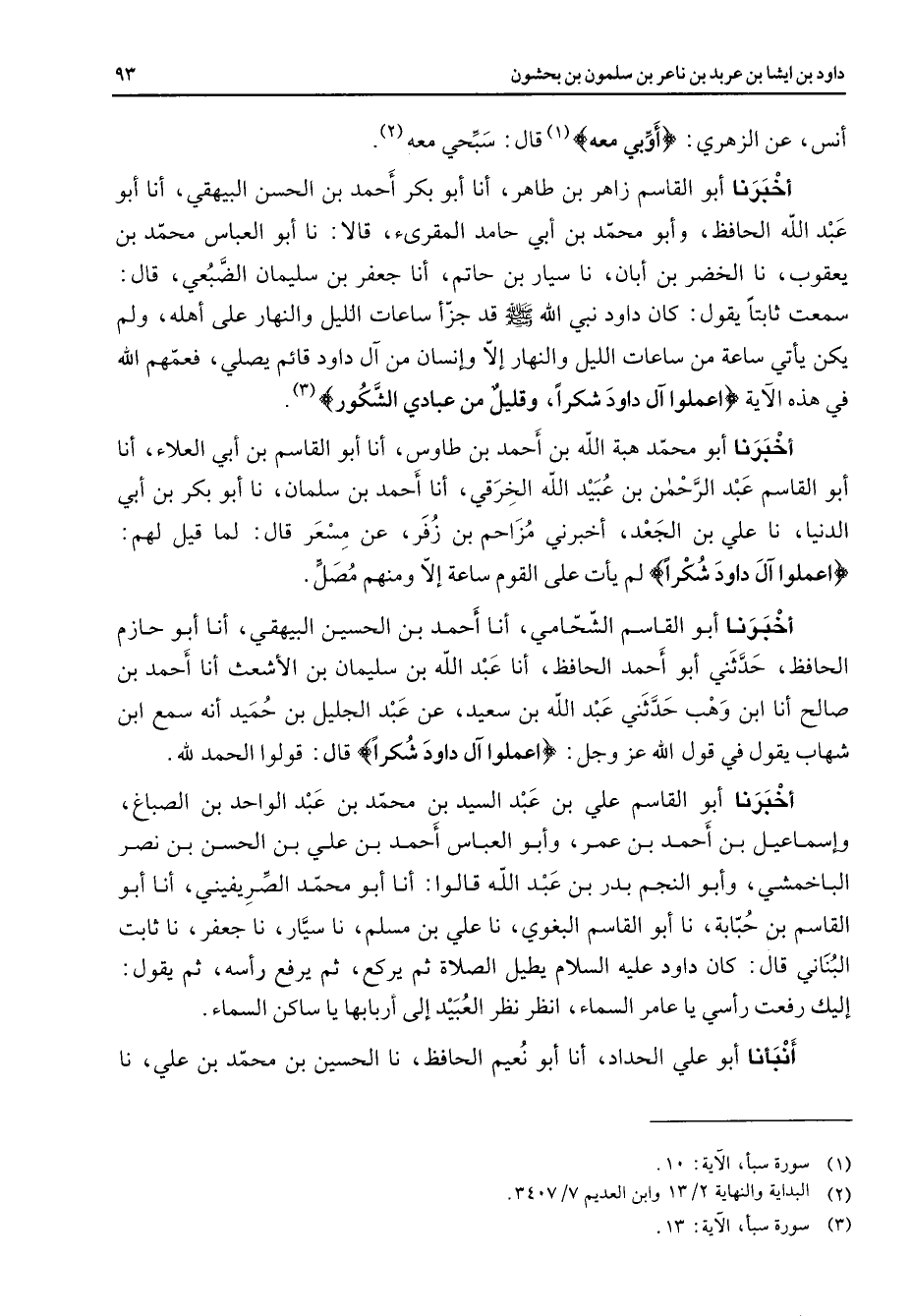 أنس عن الزهري " أوبي معه " (1) قال سبحي معه (2) أخبرنا أبو القاسم زاهر بن طاهر أنا أبو بكر أحمد بن الحسن البيهقي أنا أبو عبد الله الحافظ وأبو محمد بن بن أبي حامد المقرئ قالا نا أبو العباس محمد بن يعقوب نا الخضر بن أبان نا سيار بن حاتم أنا جعفر بن سليمان الضبعي قال سمت ثابتا يقول كان داود نبي الله (صلى الله عليه وسلم) قد جزأ ساعات الليل والنهار على أهله ولم يكن يأتي ساعة من ساعات الليل والنهار إلا وإنسان من آل داود قائم يصلي فعمهم الله في هذه الآية " اعملوا آل داود شكرا وقليل من عبادي الشكور " (3) أخبرنا أبو محمد هبة الله بن أحمد بن طاوس أنا أبو القاسم بن أبي العلاء أنا أبو القاسم عبد الرحمن بن عبيد الله الخرقي أنا أحمد بن سلمان نا أبو بكر بن أبي الدنيا نا علي بن الجعد أخبرني مزاحم بن زفر عن مسعر قال لما قيل لهم " اعملوا آل داود شكرا " لم يأت على القوم ساعة إلا ومنهم مصل أخبرنا أبو القاسم الشحامي أنا أحمد بن الحسين البيهقي أنا أبو حازم الحافظ حدثني أبو أحمد الحافظ أنا عبد الله بن سليمان بن الأشعث أنا أحمد بن صالح أنا ابن وهب حدثني عبد الله بن سعيد عن عبد الجليل بن حميد أنه سمع ابن شهاب يقول في قول الله عز وجل " اعملوا آل داود شكرا " قال قولوا الحمد لله أخبرنا أبو القاسم علي بن عبد السيد بن محمد بن عبد الواحد بن الصباغ وإسماعيل بن أحمد بن عمر وأبو العباس أحمد بن علي بن الحسن بن نصر الباخمشي وأبو النجم بدر بن عبد الله قالوا أنا أبو محمد الصريفيني أنا أبو القاسم بن حبابة نا أبو القاسم البغوي نا علي بن مسلم نا سيار نا جعفر نا ثابت البناني قال كان داود عليه السلام يطيل الصلاة ثم يركع ثم يرفع رأسه ثم يقول إليك رفعت رأسي يا عامر السماء انظر نظر العبيد إلى أربابها يا ساكن السماء أنبأنا أبو علي الحداد أنا أبو نعيم الحافظ نا الحسين بن محمد بن علي نا