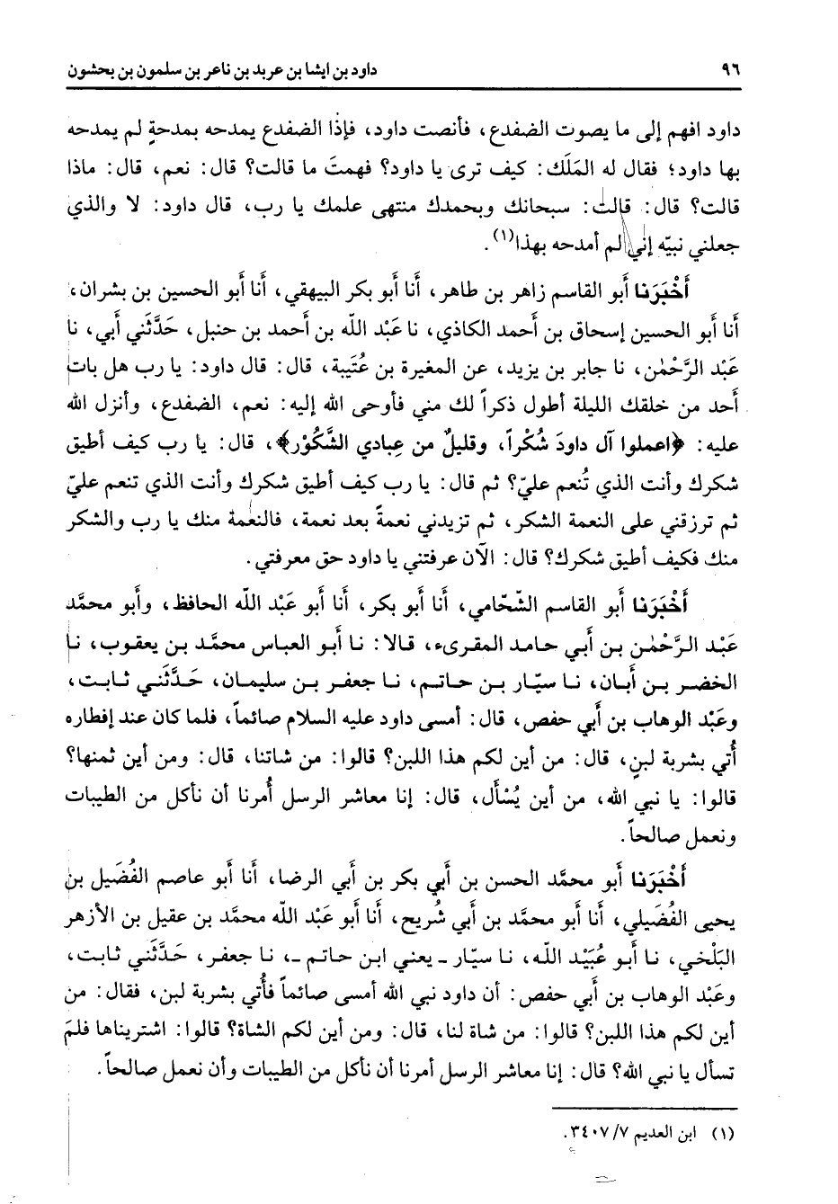 داود افهم إلى ما يصوت الضفدع فأنصت داود فإذا الضفدع يمدحه بمدحة لم يمدحه بها داود فقال له الملك كيف ترى يا داود فهمت ما قالت قال نعم قال ماذا قالت قال قالت سبحانك وبحمدك منتهى علمك يا رب قال داود لا والذي جعلني نبيه إني لم أمدحه بهذا (1) أخبرنا أبو القاسم زاهر بن طاهر أنا أبو بكر البيهقي أنا أبو الحسين بن بشران أنا أبو الحسين إسحاق بن أحمد الكاذي نا عبد الله بن أحمد بن حنبل حدثني أبي نا عبد الرحمن نا جابر بن يزيد عن المغيرة بن عتيبة قال قال داود يا رب هل بات أحد من خلقك الليلة أطول ذكرا لك مني فأوحى الله إليه نعم الضفدع وأنزل الله عليه " اعملوا آل داود شكرا وقليل من عبادي الشكور " قال يا رب كيف أطيق شكرك وأنت الذي تنعم علي ثم قال يا رب كيف أطيق شكرك وأنت الذي تنعم علي ثم ترزقني على النعمة الشكر ثم تزيدني نعمة بعد نعمة فالنعمة منك يا رب والشكر منك فكيف أطيق شكرك قال الآن عرفتني يا داود حق معرفتي أخبرنا أبو القاسم الشحامي أنا أبو بكر أنا أبو عبد الله الحافط وأبو محمد عبد الرحمن بن أبي حامد المقرئ قالا نا أبو العباس محمد بن يعقوب نا الخضر بن أبان نا سيار بن حاتم نا جعفر بن سليمان حدثني ثابت وعبد الوهاب بن أبي حفص قال أمسى داود عليه السلام صائما فلما كان عند إفطاره أتي بشربة لبن فقال من أين لكم هذا اللبن قالوا من شاتنا قال ومن أين ثمنها قالوا يا نبي الله من أين يسأل قال إنا معاشر الرسل أمرنا أن نأكل من الطيبات ونعمل صالحا أخبرنا أبو محمد الحسن بن أبي بكر بن أبي الرضا أنا أبو عاصم الفضيل بن يحيى الفضيلي أنا أبو محمد بن أبي شريح أنا أبو عبد الله محمد بن عقيل بن الأزهر البلخي نا أبو عبيد الله نا سيار يعني ابن حاتم نا جعفر حدثني ثابت وعبد الوهاب بن أبي حفص أن داود نبي الله أمسى صائما فأتي بشربة لبن فقال من أين لكم هذا اللبن قالوا من شاة لنا قال ومن أين لكم الشاة قالوا اشتريناها فلم تسأل يا نبي الله قال إنا معاشر الرسل أمرنا أن نأكل من الطيبات وأن نعمل صالحا