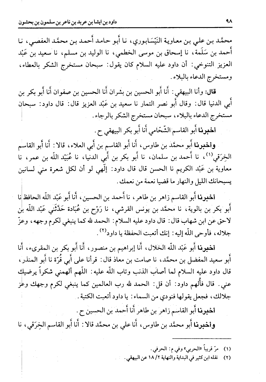محمد بن علي بن معاوية النيسابوري نا أبو حامد أحمد بن محمد العفصي نا أحمد بن سلمة نا إسحاق بن موسى الخطمي نا الوليد بن مسلم نا سعيد بن عبد العزيز التنوخي أن داود عليه السلام كان يقول سبحان مستخرج الشكر بالعطاء ومستخرج الدعاء بالبلاء قال وأنا البيهقي أنا أبو الحسين بن بشران أنا الحسين بن صفوان أنا أبو بكر بن أبي الدنيا قال وقال أبو نصر التمار نا سعيد بن عبد العزيز قال قال داود سبحان مستخرج الدعاء بالبلاء سبحان مستخرج الشكر بالرجاء أخبرنا أبو القاسم الشحامي أنا أبو بكر البيهقي وأخبرنا أبو محمد بن طاوس أنا أبو القاسم بن أبي العلاء قالا أنا أبو القاسم الخرقي نا أحمد بن سلمان نا أبو بكر بن أبي الدنيا نا عبيد الله بن عمر نا معاوية بن عبد الكريم نا الحسن قال قال داود إلهي لو أن لكل شعرة مني لسانين يسبحانك الليل والنهار ما قضيا نعمة من نعمك أخبرنا أبو القاسم زاهر بن طاهر نا أحمد بن الحسين أنا أبو عبد الله الحافظ نا أبو بكر بن بالوية نا محمد بن يونس القرشي نا روح بن عبادة حدثني عبد الله بن لاحق عن ابن شهاب قال قال داود عليه السلام الحمد لله كما ينبغي لكرم وجهه وعز جلاله فأوحى الله إليه إنك أتعبت الحفظة يا داود (2) أخبرنا أبو عبد الله الخلال أنا إبراهيم بن منصور أنا أبو بكر بن المقرئ أنا أبو سعيد المفضل بن محمد نا صامت بن معاذ قال قرأنا على أبي قرة نا أبو المنذر قال داود عليه السلام لما أصاب الذنب وتاب الله عليه اللهم ألهمني شكرا يرضيك عني قال فألهم داود أن قل الحمد لله رب العالمين كما ينبغي لكرم وجهك وعز جلالك فجعل يقولها فنودي من السماء يا داود أتعبت الكتبة أخبرنا أبو القاسم زاهر بن طاهر أنا أحمد بن الحسين وأخبرنا أبو محمد بن طاوس أنا علي بن محمد قالا أنا أبو القاسم الخرقي نا