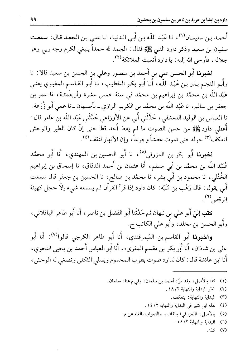 أحمد بن سليمان (1) نا عبد الله بن أبي الدنيا نا علي بن الجعد قال سمعت سفيان بن سعيد وذكروذكر داود النبي (صلى الله عليه وسلم) فقال الحمد لله حمدا ينبغي لكرم وجه ربي وعز جلاله فأوحى الله إليه يا داود أتعبت الملائكة (2) أخبرنا أبو الحسن علي بن أحمد بن منصور وعلي بن الحسن بن سعيد قالا نا وأبو النجم بدر بن عبد الله أنا أبو بكر الخطيب نا أبو القاسم المغيري يعني عبد الله بن محمد بن إبراهيم بن محمد في سنة خمس عشرة وأربعمئة نا عمر بن جعفر بن سالم نا عبد الله بن محمد بن الكريم الرازي بأصبهان نا عمي أبو زرعة نا العباس بن الوليد الدمشقي حدثني أبي عن الأوزاعي حدثني عبد الله بن عامر قال أعطي داود (صلى الله عليه وسلم) من حسن الصوت ما لم يعط أحد قط حتى إن كان الطير والوحش لتعكف (3) حوله حتى تموت عطشا وجوعا وإن الأنهار لتقف (4) أخبرنا أبو بكر بن المزرفي (5) نا أبو الحسين بن المهتدي أنا أبو محمد عبيد الله بن محمد بن أبي مسلم أنا عثمان بن أحمد الدقاق نا إسحاق بن إبراهيم الختلي نا محمود بن أبي بشر نا محمد بن صالح نا الحسين بن جعفر قال سمعت أبي يقول قال وهب بن منبه كان داود إذا قرأ القرآن لم يسمعه شئ إلا حجل كهيئة الرقص (6) كتب إلي أبو علي بن نبهان ثم حدثنا أبو الفضل بن ناصر أنا أبو طاهر الباقلاني وأبو الحسن بن مخلد وأبو علي الكاتب وأخبرنا أبو القاسم بن السمرقندي أنا أبو طاهر الكرجي قالوا (7) أنا أبو علي بن شاذان أنا أبو بكر بن مقسم المقرئ أنا أبو العباس أحمد بن يحيى النحوي أنا ابن عائشة قال كان لداود صوت يطرب المحموم ويسلي الثكلى وتصغي له الوحش
