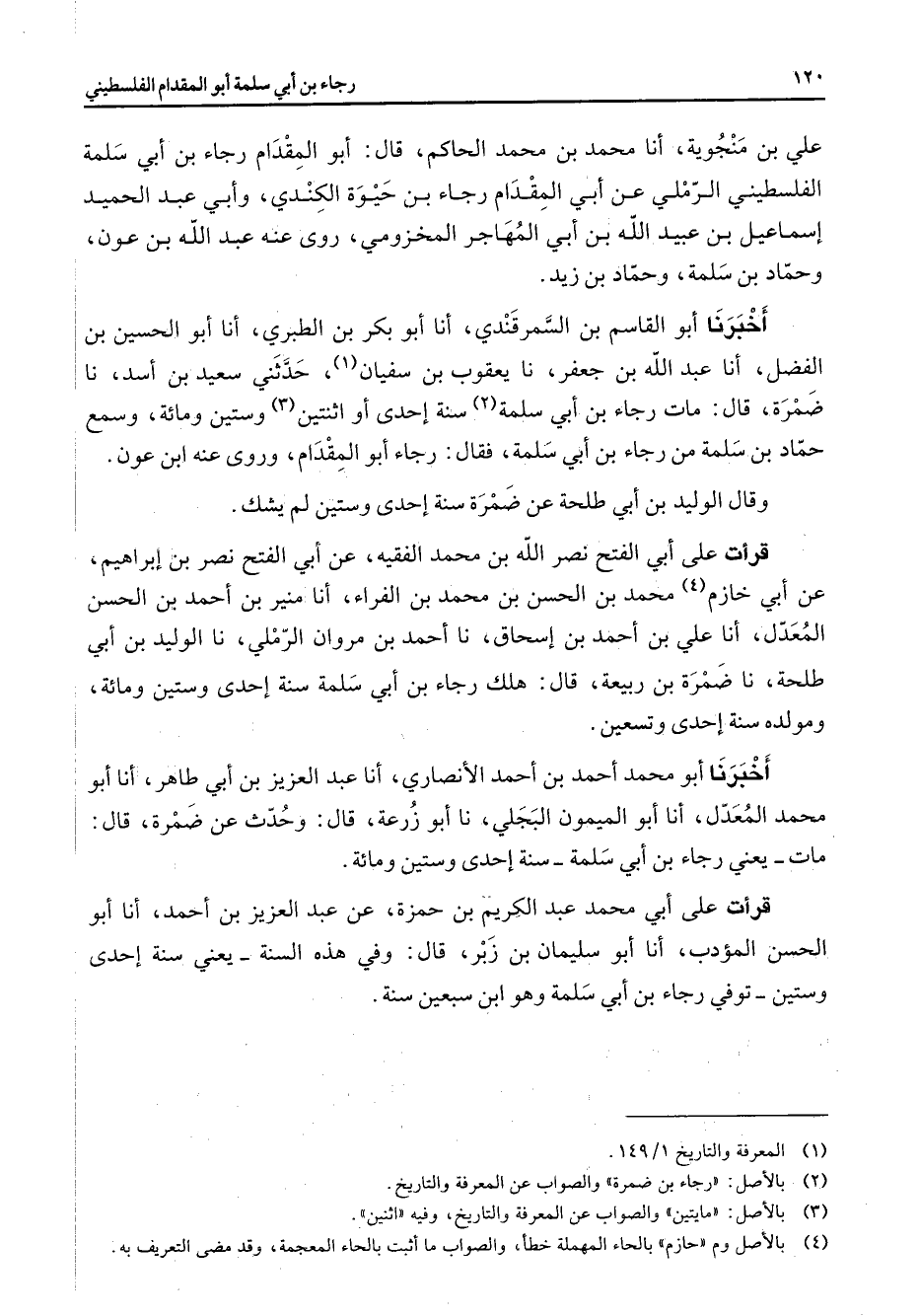 علي بن منجوية أنا محمد بن محمد الحاكم قال أبو المقدام رجاء بن أبي سلمة الفلسطيني الرملي عن أبي المقدام رجاء بن حيوة الكندي وأبي عبد الحميد إسماعيل بن عبيد الله بن أبي المهاجر المخزومي روى عنه عبد الله بن عون وحماد بن سلمة وحماد بن زيد أخبرنا أبو القاسم بن السمرقندي أنا أبو بكر بن الطبري أنا أبو الحسين بن الفضل أنا عبد الله بن جعفر نا يعقوب بن سفيان (1) حدثني سعيد بن أسد نا ضمرة قال مات رجاء بن أبي سلمة (2) سنة إحدى أو إثنتين (3) وستين ومائة وسمع حماد بن سلمة من رجاء بن أبي سلمة فقال رجاء أبو المقدام وروى عنه ابن عون وقال الوليد بن أبي طلحة عن ضمرة سنة إحدى وستين لم يشك قرأت على أبي الفتح نصرالله بن محمد الفقيه عن أبي الفتح نصر بن إبراهيم عن أبي خازم (4) محمد بن الحسن بن محمد بن الفراء أنا منير بن أحمد بن الحسن المعدل أنا علي بن أحمد بن إسحاق نا أحمد بن مروان الرملي نا الوليد بن أبي طلحة نا ضمرة بن ربيعة قال هلك رجاء بن أبي سلمة سنة إحدى وستين ومائة ومولده سنة إحدى وتسعين أخبرنا أبو محمد أحمد بن أحمد الأنصاري أنا عبد العزيز بن أبي طاهر أنا أبو محمد المعدل أنا أبو الميمون البجلي نا أبو زرعة قال وحدث عن ضمرة قال مات يعني رجاء بن أبي سلمة سنة إحدى وستين ومائة قرأت على أبي محمد عبد الكريم بن حمزة عن عبد العزيز بن أحمد أنا أبو الحسن المؤدب أنا أبو سليمان بن زبر قال وفي هذه السنة يعني سنة إحدى وستين توفي رجاء بن أبي سلمة وهو ابن سبعين سنة