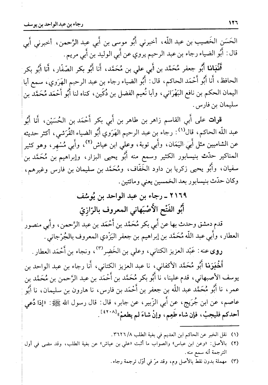 2169 - رجاء بن عبد الواحد بن يوسف أبو الفتح الأصبهاني المعروف بالرازي قدم دمشق وحدث بها عن أبي بكر محمد بن أحمد بن عبد الرحمن وأبي منصور العطار وأبي عبد الله محمد بن إبراهيم بن جعفر اليزدي المعروف بالجرجاني روى عنه عبد العزيز الكتاني وعلي بن الخضر (3) ونجاء بن أحمد العطار أخبرنا أبو محمد الأكفاني نا عبد العزيز الكتاني أنا رجاء بن عبد الواحد بن يوسف الأصبهاني قدم علينا نا أبو بكر محمد بن أحمد بن عبد الرحمن بن محمد بن عمر نا أبو محمد عبد الله بن جعفر بن أحمد بن فارس نا هارون بن سليمان نا أبو عاصم عن ابن جريج عن أبي الزبير عن جابر قال قال رسول الله (صلى الله عليه وسلم) إذا دعي أحدكم فليجب فإن شاء طعم وإن شاء لم يطعم