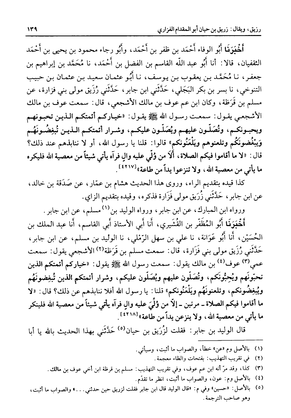 أخبرنا أبو الوفاء أحمد بن ظفر بنأحمد وأبو رجاء محمود بن يحيى بن أحمد الثقفيان قالا أنا أبو عبد الله القاسم بن الفضل بن أحمد نا محمد بن إبراهيم بن جعفر نا محمد بن يعقوب بن يوسف نا أبو عثمان سعيد بن عثمان بن حبيب التنوخي نا بسر بن بكر البجلي حدثني ابن جابر حدثني رزيق مولى بني فزارة عن مسلم بن قرظة وكان ابن عم عوف بن مالك الأشجعي قال سمعت عوف بن مالك الأشجعي يقول سمعت رسول الله يقول خياركم أئمتكم الذين تحبونهم ويحبونكم وتصلون عليهم ويصلون عليكم وشرار أئمتكم الذين تبغضونهم ويبغضونكم وتلعنونهم ويلعنونكم قالوا يا رسول الله أو لا ننابذهم عند ذلك قال لا ما أقاموا فيكم الصلاة ألا من ولي عليه وال فرآه يأتي شيئا من معصية الله فليكره ما يأتي ممن معصية ولا تنزعوا يدا من طاعة كذا قيده بتقديم الراء وروى هذا الحديث هشام بن عمار عن صدقة بن خالد عن ابن جابر حدثني زريق مولى فزارة فذكره وقيده بتقديم الزاي ورواه ابن المبارك عن ابن جابر ورواه الوليد عن (1) مسلم عن ابن جابر أخبرنا أبو المظفر بن القشيري أنا أبي الأستاذ أبي القاسم أنا عبد الملك بن الحسين أنا أبو عوانة نا علي بن سهل الرملي نا الوليد بن مسلم عن ابن جابر حدثني رزيق مولى بني فزارة قال سمعت مسلم بن قرظة (2) الأشجعي يقول سمعت عمي (3) عوف (4) بن مالك يقول سمعت رسول الله (صلى الله عليه وسلم) يقول خياركم أئمتكم الذين تحبونهم وتصلون عليهم ويصلون عليكم وشرار أئمتكم الذين تبغضونهم ويبغضونكم وتلعنونهم ويلعنونكم قلنا يا رسول الله أفلا ننابذهم عن ذلك قال لا ما أقاموا فيكم الصلاة مرتين إلا من ولي عليه وال فرآه يأتي شيئا من معصية الله فلينكر ما يأتي من معصية الله ولا ينزعن يدا من طاعة قال الوليد بن جابر فقلت لزريق بن حيان حدثني بهذا الحديث بالله يا أبا