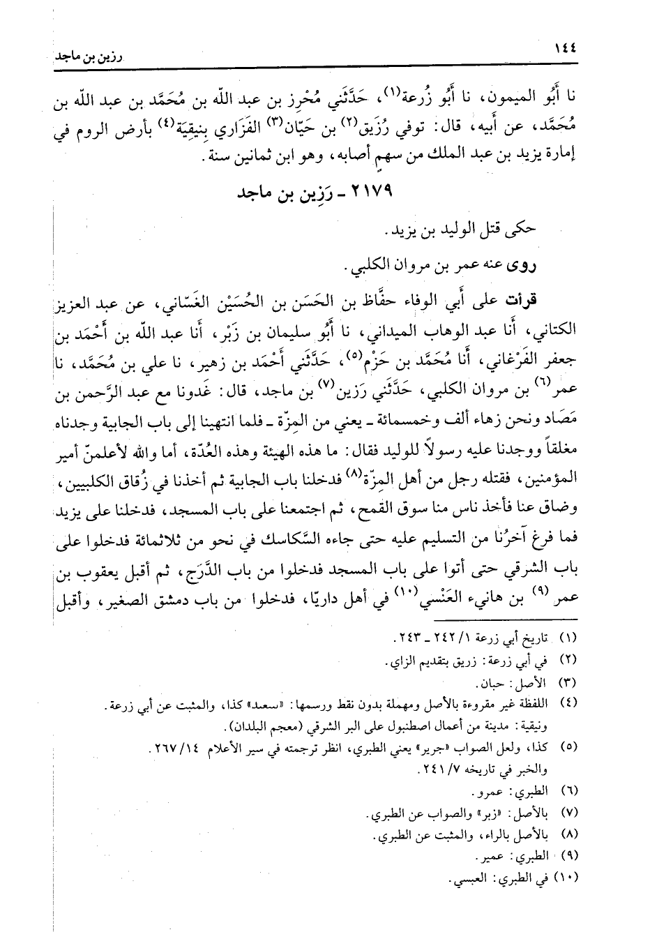 2179 - رزين بن ماجد حكى قتل الوليد بن يزيد روى عنه عمر بن مروان الكلبي قرأت على أبي الوفاء حفاظ بن الحسن بن الحسين الغساني عن عبد العزيز الكتاني أنا عبد الوهاب الميداني نا أبو سليمان بن زبر أنا عبد الله بن أحمد بن جعفر الفرغاني أنا محمد بن حزم (5) حدثني أحمد بن زهير نا علي بن محمد نا عمر (6) بن مروان الكلبي حدثني رزين (7) بن ماجد قال غدونا مع عبد الرحمن بن مصاد ونحن زهاء ألف وخمسمائة يعني من المزة فلما انتهينا إلى باب الجابية وجدناه مغلقا ووجدنا عليه رسولا للوليد فقال ما هذه الهيئة وهذه العدة أما والله لأعلمن أمير المؤمنين فقتله رجل من أهل المزة (8) فدخلنا باب الجابية ثم أخذنا في زقاق الكلبيين وضاق عنا فأخذ ناس منا سوق القمح ثم اجتمعنا على باب المسجد فدخلنا على يزيد فما فرغ آخرنا من التسليم عليه حتى جاءه السكاسك في نحو من ثلاثمائة فدخلوا على باب الشرقي حتى اتوا على باب المسجد فدخلوا من باب الدرج ثم أقبل يعقوب بن عمر (9) بن هانئ العنسي (10) في اهل داريا فدخلوا من باب دمشق الصغير وأقبل