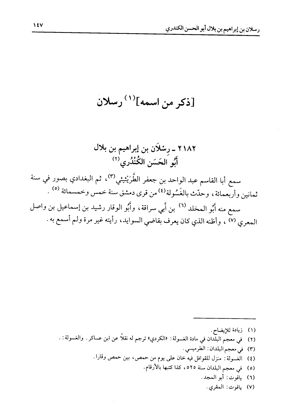 2182 - رسلان بن إبراهيم بن بلال أبو الحسن الكندري (2) سمع أبا القاسم عبد الواحد بن جعفر الطريثيثي (3) ثم البغدادي بصور في سنة ثمانين وأربعمائة وحدث بالغسولة (4) من قرى دمشق سنة خمس وخمسمائة (5) سمع منه أبو المخلد (6) بن أبي سراقة وأبو الوقار رشيد بن إسماعيل بن واصل المعري (7) وأظنه الذي كان يعرف بقاضي السوايد رأيته غير مرة ولم أسمع به "