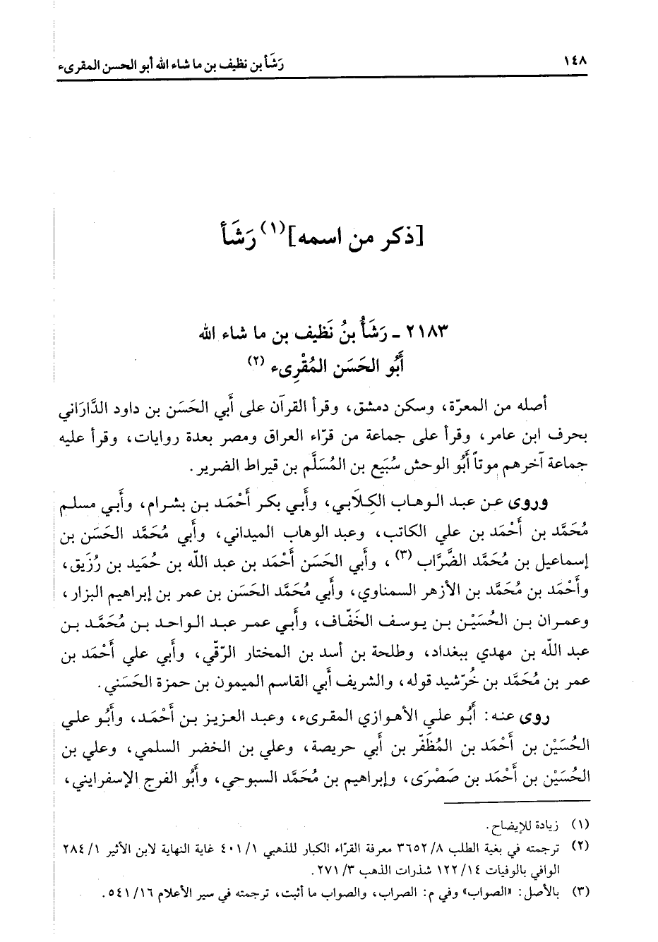 2183 - رشأ بن نظيف بن ما شاء الله أبو الحسن المقرئ (2) أصله من المعرة وسكن دمشق وقرأ القرآن على أبي الحسن بن داود الداراني بحرف ابن عامر وقرأ على جماعة من قراء العراق ومصر بعدة روايات وقرأ عليه جماعة آخرهم موتا أبو الوحش سبيع بن المسلم بن قيراط الضرير وروى عن عبد الوهاب الكلابي وأبي بكر أحمد بن بشرام وأبي مسلم محمد بن أحمد بن علي الكاتب وعبد الوهاب الميداني وأبي محمد الحسن بن إسماعيل بن محمد الضراب (3) وأبي الحسن أحمد بن عبد الله بن حميد بن زريق وأحمد بن محمد بن الأزهر السمناوي وأبي محمد الحسن بن عمر بن إبراهيم البزار وعمران بن الحسين بن يوسف الخفاف وأبي عمر عبد الواحد بن محمد بن عبد الله بن مهدي ببغداد وطلحة بن أسد بن المختار الرقي وأبي علي أحمد بن عمر بن محمد بن خرشيد قوله والشريف ابي القاسم الميمون بن حمزة الحسني روى عنه أبو علي الأهوازي المقرئ وعبد العزيز بن أحمد وأبو علي الحسين بن أحمد بن المظفر بن أبي حريصة وعلي بن الخضر السلمي وعلي بن الحسين بن أحمد بن صصرى وإبراهيم بن محمد السبوحي وأبو الفرج الإسفرايني