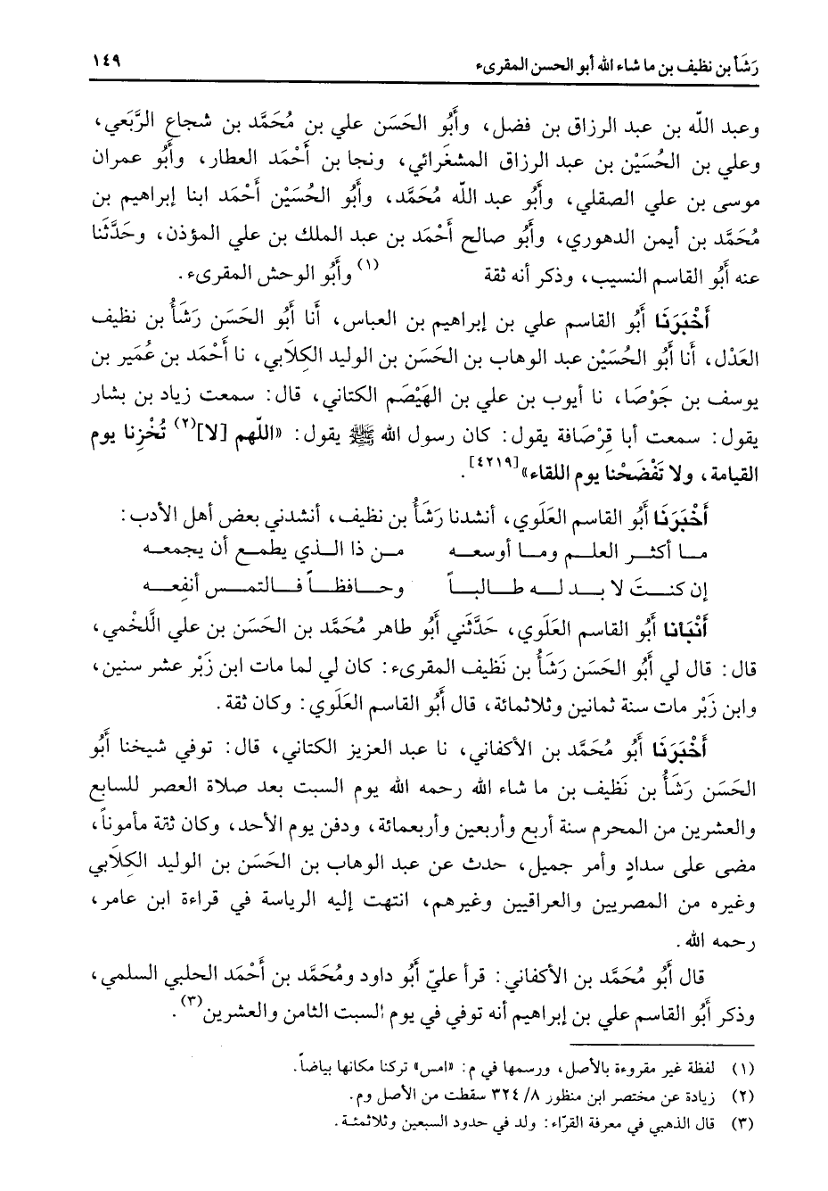 وعبد الله بن عبد الرزاق بن فضل وأبو الحسن علي بن محمد بن شجاع الربعي وعلي بن الحسين بن عبد الرزاق المشغرائي ونجا بن أحمد العطار وأبو عمران موسى بن علي الصقلي وأبو عبد الله محمد وأبو الحسين أحمد ابنا إبراهيم بن محمد بن أيمن الدهوري وأبو صالح أحمد بن عبد الملك بن علي بن المؤذن وحدثنا عنه أبو القاسم النسيب وذكر أنه ثقة (1) وأبو الوحش المقرئ أخبرنا أبو القاسم علي بن إبراهيم بن العباس أنا أبو الحسن رشأ بن نظيف العدل أنا أبو الحسين عبد الوهاب بن الحسن بن الوليد الكلابي نا أحمد بن عمير بن يوسف بن جوصا نا أيوب بن علي بن الهيصم الكتاني قال سمعت زياد بن بشار يقول سمعت أبا قرصافة يقول كان رسول الله (صلى الله عليه وسلم) يقول اللهم لا (2) تخزنا يوم القيامة ولا تفضحنا يوم اللقاء أخبرنا أبو القاسم العلوي أنشدنا رشأ بن نظيف أنشدني بعض أهل الأدب * ما أكثر العلم وما أوسعه * من ذا الذي يطمع أن يجمعه إن كنت لا بد له طالبا * وحافظا فالتمس أنفعه * أنبأنا أبو القاسم العلوي حدثني أبو طاهر محمد بن الحسن بن علي اللخمي قال قال لي أبو الحسن رشأ بن نظيف المقرئ كان لي لما مات ابن زبر عشر سنين وابن زبر مات سنة ثمانين وثلاثمائة قال أبو القاسم العلوي وكان ثقة أخبرنا أبو محمد بن الأكفاني نا عبد العزيز الكتاني قال توفي شيخنا أبو الحسن رشأ بن نظيف بن ما شاء الله رحمه الله يوم السبت بعد صلاة العصر للسابع والعشرين من المحرم سنة أربع وأربعين وأربعمائة ودفن يوم الأحد وكان ثقة مأمونا مضى على سداد وأمر جميل حدث عن عبد الوهاب بن الحسن بن الوليد الكلابي وغيره من المصريين والعراقيين وغيرهم انتهيت إليه الرياسة في قراءة ابن عامر رحمه الله قال أبو محمد بن الأكفاني قرأعلي أبو داود ومحمد بن أحمد الحلبي السلمي وذكر أبو القاسم علي بن إبراهيم أنه توفي في يوم السبت الثامن والعشرين (3) "