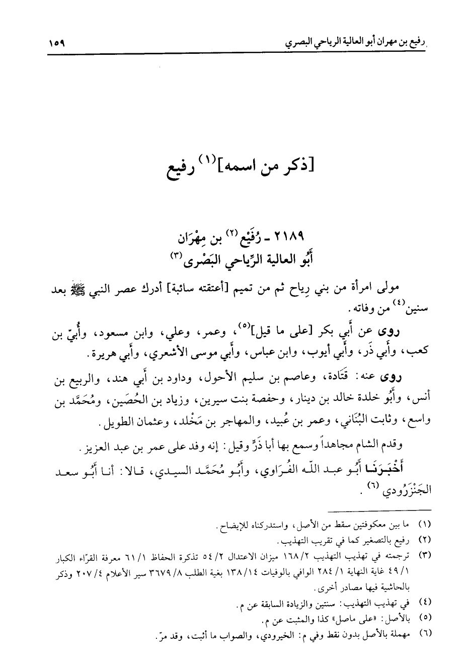 2189 - رفيع (2) بن مهران أبو العالية الرياحي البصري (3) مولى امرأة من بني رياح ثم من تميم أعتقته سائبة أدرك عصر النبي (صلى الله عليه وسلم) بعد سنين (4) من من وفاته روى عن أبي بكر على ما قيل (5) وعمر وعلي وابن مسعود وأبي بن كعب وأبي ذر وأبي أيوب وابن عباس وأبي موسى الأشعري وأبي هريرة روى عنه قتادة وعاصم بن سليم الأحول وداود بن أبي هند والربيع بن أنس وأبو خلدة خالد بن دينار وحفصة بنت سيرين وزياد بن الحصين ومحمد بن واسع وثابت البناني وعمر بن عبيد والمهاجر بن مخلد وعثمان الطويل وقدم الشام مجاهدا وسمع بها أبا ذر وقيل إنه وفد على عمر بن عبد العزيز أخبرنا أبو عبد الله الفراوي وأبو محمد السيدي قالا أنا أبو سعد الجنزرودي (6)