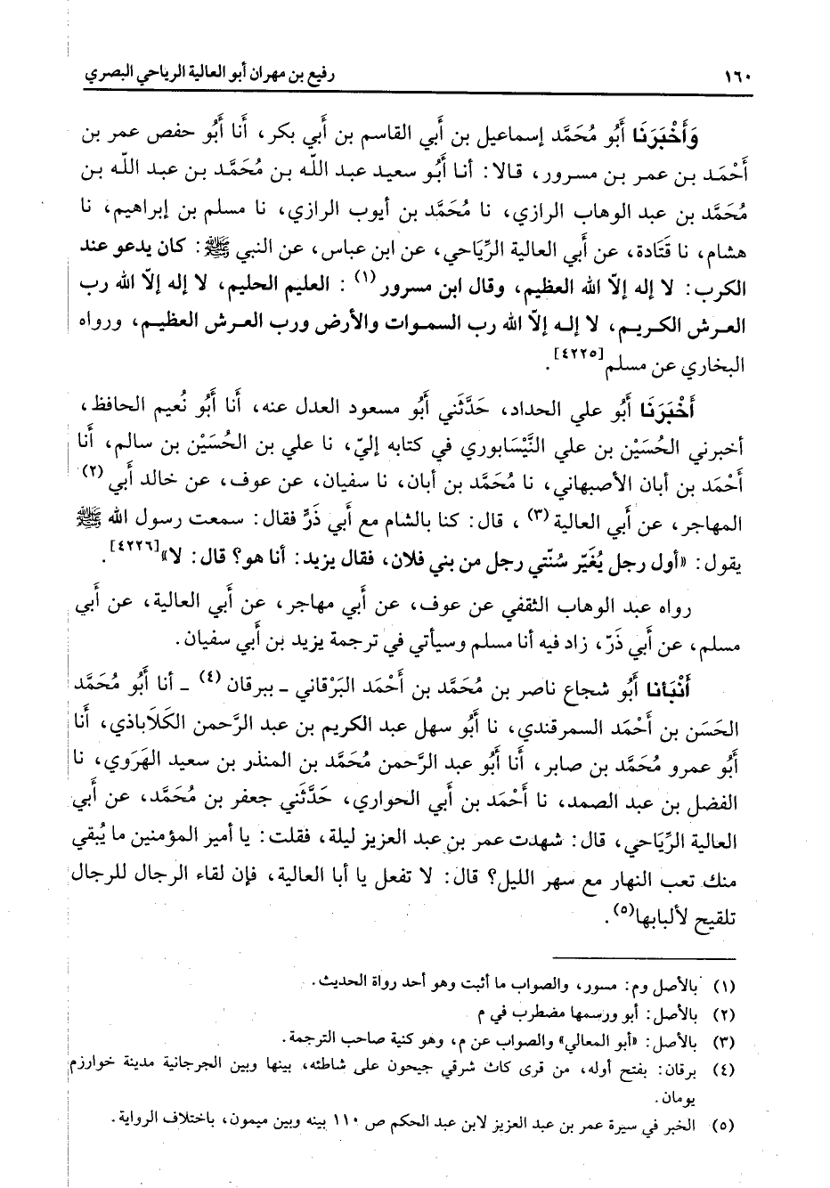 وأخبرنا أبو محمد إسماعيل بن أبي القاسم بن أبي بكر أنا أبو حفص عمر بن أحمد بن عمر بن مسرور قالا أنا أبو سعيد عبد الله بن محمد بن محمد بن عبد الله بن محمد بن عبد الوهاب الرازي نا محمد بن أيوب الرازي نا مسلم بن إبراهيم نا هشام نا قتادة عن أبي العالية الرياحي عنابن عباس عن النبي (صلى الله عليه وسلم) كان يدعو عند الكرب لا إله إلا الله العظيم وقال ابن مسرور (1) العليم الحليم لا إله إلا الله رب العرش الكريم لا إله إلا الله رب السموات والأرض ورب العرش العظيم رواه البخاري عن مسلم أخبرنا أبو علي الحداد حدثني أبو مسعود العدل عنه أنا أبو نعيم الحافظ أخبرني الحسين بن علي النيسابوري في كتابه إلي نا علي بن الحسين بن سالم أنا أحمد بن أبان الأصبهاني نا محمد بن أبان نا سفيان عن عوف عن خالد أبي (2) المهاجر عن أبي العالية (3) قال كنا بالشام مع أبي ذر فقال سمعت رسول الله (صلى الله عليه وسلم) يقول أول رجل يغير سنتي رجل من بني فلان فقال يزيد أنا هو قال لا رواه عبد الوهاب الثقفي عن عوف عن أبي مهاجر عن أبي العالية عنأبي مسلم عن أبي ذر زاد فيه أنا مسلم وسيأتي في ترجمة يزيد بن أبي سفيان أنبأنا أبو شجاع ناصر بن محمد بن أحمد البرقاني ببرقان (4) أنا أبو محمد الحسن بنأحمد السمرقندي نا أبو سهل عبد الكريم بن عبد الرحمن الكلاباذي أنا أبو عمرو محمد بن صابر أنا أبو عبد الرحمن محمدم بن المنذر بن سعيد الهروي نا الفضل بن عبد الصمد نا أحمد بن أبي الحواري حدثني جعفر بن محمد عن أبي العالية الرياحي قال شهدت عمر بن عبد العزيز ليلة فقلت يا أمير المؤمنين ما يبقي منك تعب النهار مع سهر الليل قال لا تفعل يا أبا العالية فإن لقاء الرجال للرجال تلقيح لألبابها (5)
