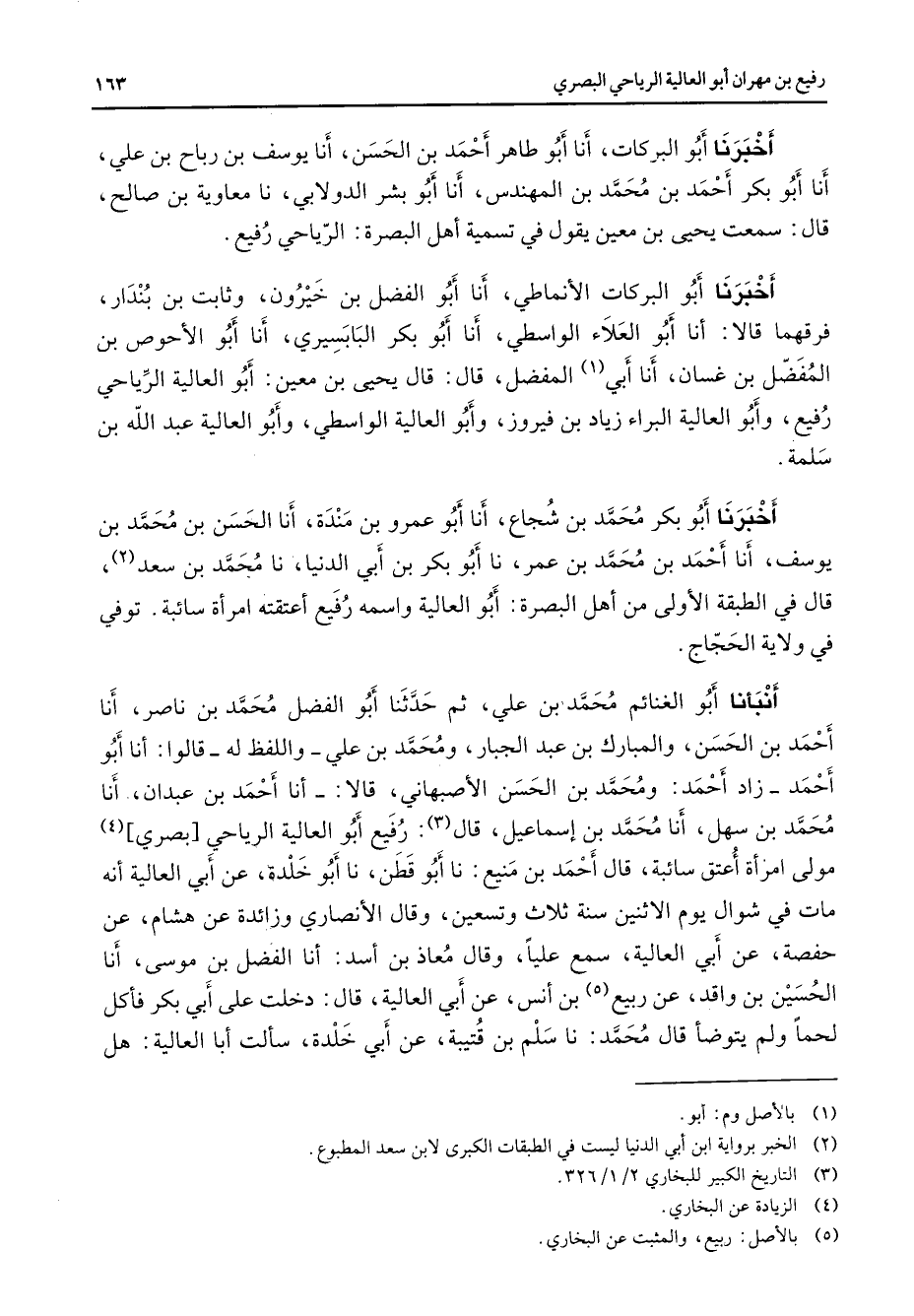 أخبرنا أبو البركات أنا أبو طاهر أحمد بن الحسن أنا يوسف بن رباح بن علي أنا أبو بكر أحمد بن محمد بن المهندس أنا أبو بشر الدولابي نا معاوية بن صالح قال سمعت يحيى بن معين يقول في تسمية أهل البصرة الرياحي رفيع أخبرنا أبو البركات الأنماطي أنا أبو الفضل بن خيرون وثابت بن بندار فرقهما قالا أنا أبو العلاء الواسطي أنا أبو بكر البابسيري أنا أبو الأحوص بن المفضل بن غسان أنا أبي (1) المفضل قال قال يحيى بن معين أبو العالية الرياحي رفيع وأبو العالية البراء زياد بن فيروز وأبو العالية الواسطي وأبو العالية عبد الله بن سلمة أخبرنا أبو بكر محمد بن شجاع أنا أبو عمرو بن مندة أنا الحسن بن محمد بن يوسف أنا أحمد بن محمد بن عمر أنا أبو بكر بن أبي الدنيا أنا محمد بن سعد (2) قال في الطبقة الأولى من أهل البصرة أبو العالية واسمه رفيع أعتقته امرأة سائبة توفي في ولاية الحجاج أنبأنا أبو الغنائم محمد بن علي ثم حدثنا أبو الفضل محمد بن ناصر أنا أحمد بن الحسن والمبارك بن عبد الجبار ومحمد بن علي واللفظ له قالوا أنا أبو أحمد زاد أحمد ومحمد بن الحسن الأصبهاني قالا أنا أحمد بن عبدان أنا محمد بن سهل أنا محمد بن إسماعيل قال (3) رفيع أبو العالية الرياحي بصري (4) مولى امرأة أعتق سائبة قال أحمد بن منيع نا أبو قطن نا أبو خلدة عن أبي العالية أنه مات في شوال يوم الاثنين سنة ثلاث وتسعين وقال الأنصاري وزائدة عن هشام عن حفصة عن أبي العالية سمع عليا وقال معاذ بن أسد أنا الفضل بن موسى أنا الحسين بن واقد عن ربيع (5) بن أنس عن أبي العالية قال دخلت على أبي بكر فأكل لحما ولم يتوضأ قال محمد نا مسلم بن قتيبة عن أبي خلدة سألت أبا العالية هل