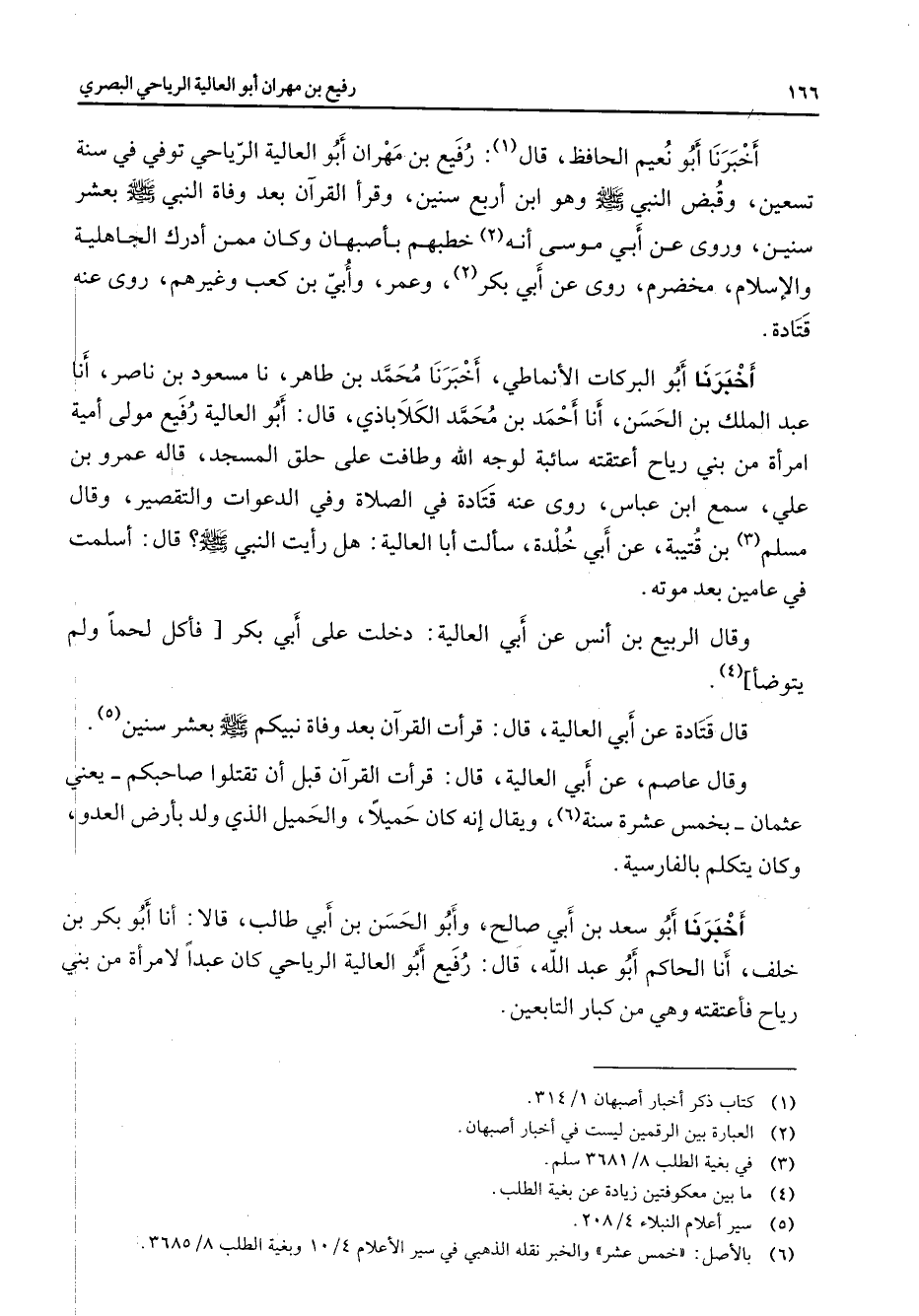 أخبرنا أبو نعيم الحافظ قال (1) رفيع بن مهران أبو العالية الرياحي توفي في سنة تسعين وقبض النبي (صلى الله عليه وسلم) وهو ابن أربع سنين وقرأ القرآن بعد وفاة النبي (صلى الله عليه وسلم) بعشر سنين وروى عنأبي موسى أنه (2) خطبهم بأصبهان وكان ممن أدرك الجاهلية والإسلام مخضرم روى عنأبي بكر (2) وعمر وأبي بن كعب وغيرهم روى عنه قتادة أخبرنا أبو البركات الأنماطي أخبرنا محمد بن بن طاهر نا مسعود بن ناصر أنا عبد الملك بن الحسن أنا أحمد بن محمد الكلاباذي قال أبو العالية رفيع مولى أمية امرأة من بني رياح أعتقته سائبة لوجه الله وطافت على حلق المسجد قاله عمرو بن علي سمع ابن عباس روى عنه قتادة في الصلاة وفي الدعوات والتقصير وقال مسلم (3) بن قتيبة عن أبي خلدة سألت أبا العالية هل رأيت النبي (صلى الله عليه وسلم) قال أسلمت في عامين بعد موته وقال الربيع بن أنس عن أبي العالية دخلت على أبي بكر فأكل لحما ولم يتوضأ (4) قال قتادة عنأبي العالية قال قرأت القرآن بعد وفاة نبيكم (صلى الله عليه وسلم) بعشر سنين (5) وقال عاصم عن أبي العالية قال قرأت القرآن قبل أن تقتلوا صاحبكم يعني عثمان بخمس عشرة سنة (6) ويقال إنه كان حميلا والحميل الذي ولد بأرض العدو وكان يتكلم بالفارسية أخبرنا أبو سعد بن أبي صالح وأبو الحسن بنأبي طالب قالا أنا أبو بكر بن خلف أنا الحاكم أبو عبد الله قال رفيع أبو العالية الرياحي كان عبدا لامرأة من بني رياح فأعتقته وهي من كبار التابعين