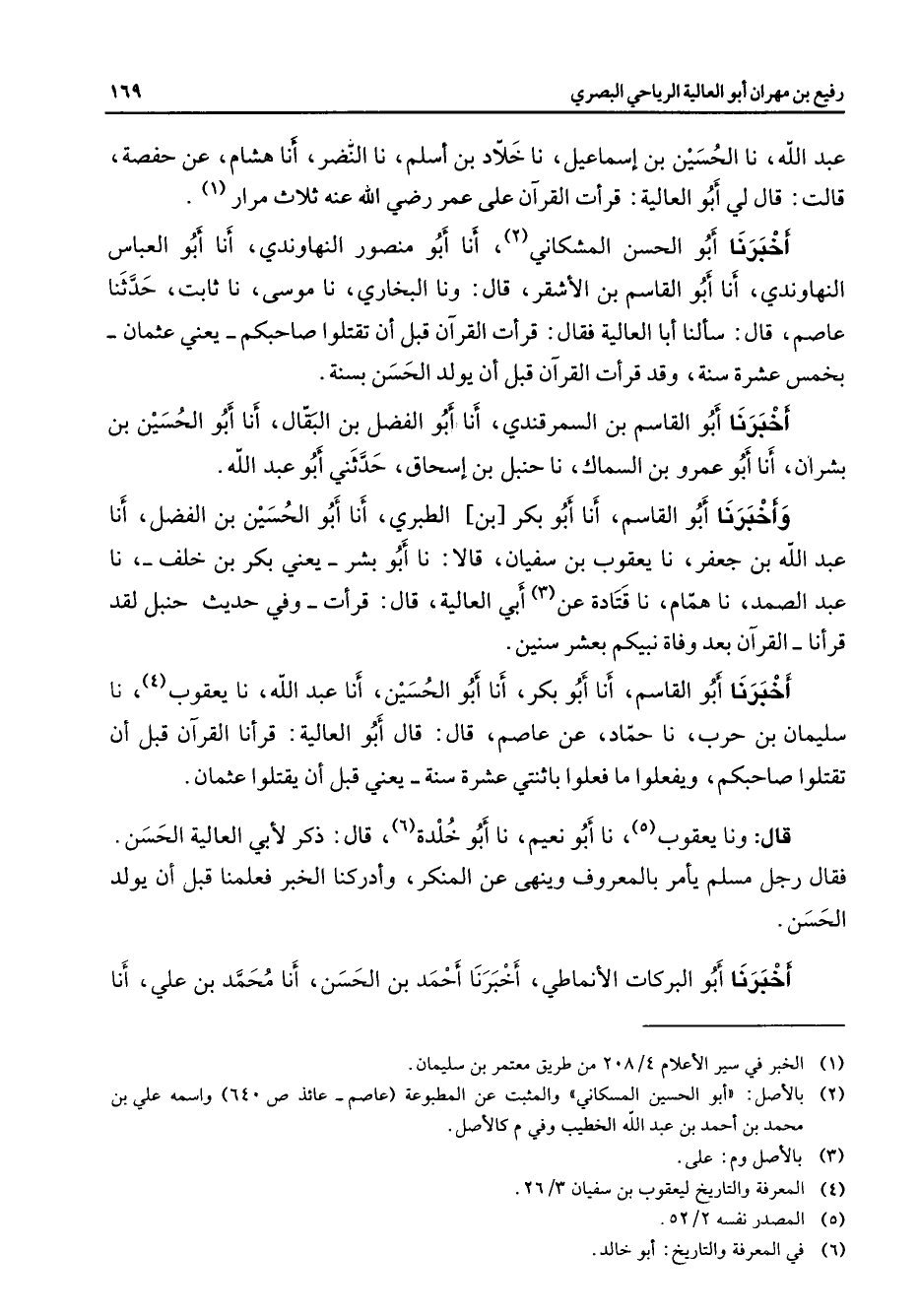 عبد الله نا الحسين بن إسماعيل نا خلاد بن أسلم نا النضر أنا هشام عن حفصة قالت قال لي أبو العالية قرأت القرآن على عمر Bهـ ثلاث مرار (1) أخبرنا أبو الحسن المشكاني (2) أنا أبو منصور النهاوندي أنا أبو العباس النهاوندي أنا أبو القاسم بن الأشقر قال ونا البخاري نا موسى نا ثابت حدثنا عاصم قال سألنا أبا العالية فقال القرأن قبل أن تقتلوا صاحبكم يعني عثمان بخمس عشرة سنة وقد قرأت القرآن قبل أن يولد الحسن بسنة أخبرنا أبو القاسم بن السمرقندي أنا أبو الفضل بن البقال أنا أبو الحسين بن بشران أنا أبو عمرو بن السماك نا حنبل بن إسحاق حدثني أبو عبد الله وأخبرنا أبو القاسم نا أبو بكر بن الطبري أنا أبو الحسين بن الفضل أنا عبد الله بن جعفر نا يعقوب بن سفيان قالا نا أبو بشر يعني بكر بن خلف نا عبد الصمد نا همام نا قتادة (3) عن أبي العالية قال قرأت وفي حديث حنبل لقد قرأنا القرآن بعد وفاة نبيكم بعشر سنين أخبرنا أبو القاسم أنا أبو بكر أنا أبو الحسين أنا عبد الله نا يعقوب (4) نا سليمان بن حرب نا حماد عن عاصم قال قال أبو العالية قرأنا القرآن قبل أن تقتلوا صاحبكم ويفعلوا ما فعلوا باثنتي عشرة سنة يعني قبل أن يقتلوا عثمان قال ونا يعقوب (5) نا أبو نعيم نا أبو خلدة (6) قال ذكر لأبي العالية الحسن فقال رجل مسلم يأمر بالمعروف وينهى عن المنكر وأدركنا الخبر فعلمنا قبل أن يولد الحسن أخبرنا أبو البركات الأنماطي أخبرنا أحمد بن الحسن أنا محمد بن علي أنا