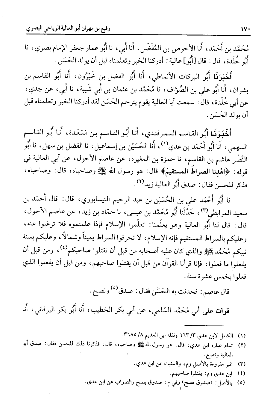 محمد بن أحمد أنا الأحوص بن المفضل أنا أبي نا أبو عمار جعفر الإمام بصري نا أبو خلدة قال قال أبو عالية أدركنا الخبر وتعلمناه قبل أن قبل أن يولد الحسن أخبرنا أبو البركات الأنماطي أنا أبو الفضل بن خيرون أنا أبو القاسم بن بشران أنا أبو علي بن الصواف نا محمد بن عثمان بن أبي شيبة نا أبي عن جدي عن أبي خلدة قال سمعت أبا العالية يقوم يترحم الحسن لقد أدركنا الخبر وتعلمناه قبل أن يولد الحسن أخبرنا أبو القاسم السمرقندي أنا أبو القاسم بن مسعدة أنا أبو القاسم السهمي أنا أبو أحمد بن عدي (1) أنا الحسين بن إسماعيل نا الفضل بن سهل نا أبو النضر هاشم بن القاسم نا حمزة بن المغيرة عن عاصم الأحول عنأبي العالية في قوله " اهدنا الصراط المستقيم " قال هو رسول الله (صلى الله عليه وسلم) وصاحباه قال وصاحباه فذكر للحسن فقال صدق أبو العالية زيد (2) نا أبو أحمد علي بن الحسين بن عبد الرحيم النيسابوري قال قال أحمد بن سعيد المرابطي (3) حدثنا أبو محمد بن عيسى نا حماد بن زيد عن عاصم الأحول قال قال لنا أبو العالية وهو يعلمنا تعلموا الإسلام فإذا علمتموه فلا ترغبوا عنه وعليكم بالسراط المستقيم فإنه الإسلام لا تحرفوا السراط يمينا وشمالا وعليكم بسنة نبيكم محمد (صلى الله عليه وسلم) والذي كان عليه أصحابه من قبل أن تقتلوا صاحبكم (4) ومن قبل أن يفعلوا ما فعلوا فإنا قرأنا القرآن من قبل أن يقتلوا صاحبكم ومن قبل أن يفعلوا الذي فعلوا بخمس عشرة سنة قال عاصم فحدثت به الحسن فقال صدق (5) ونصح قرأت على أبي محمد السلمي عنأبي بكر الخطيب أنا أبو بكر البرقاني أنا