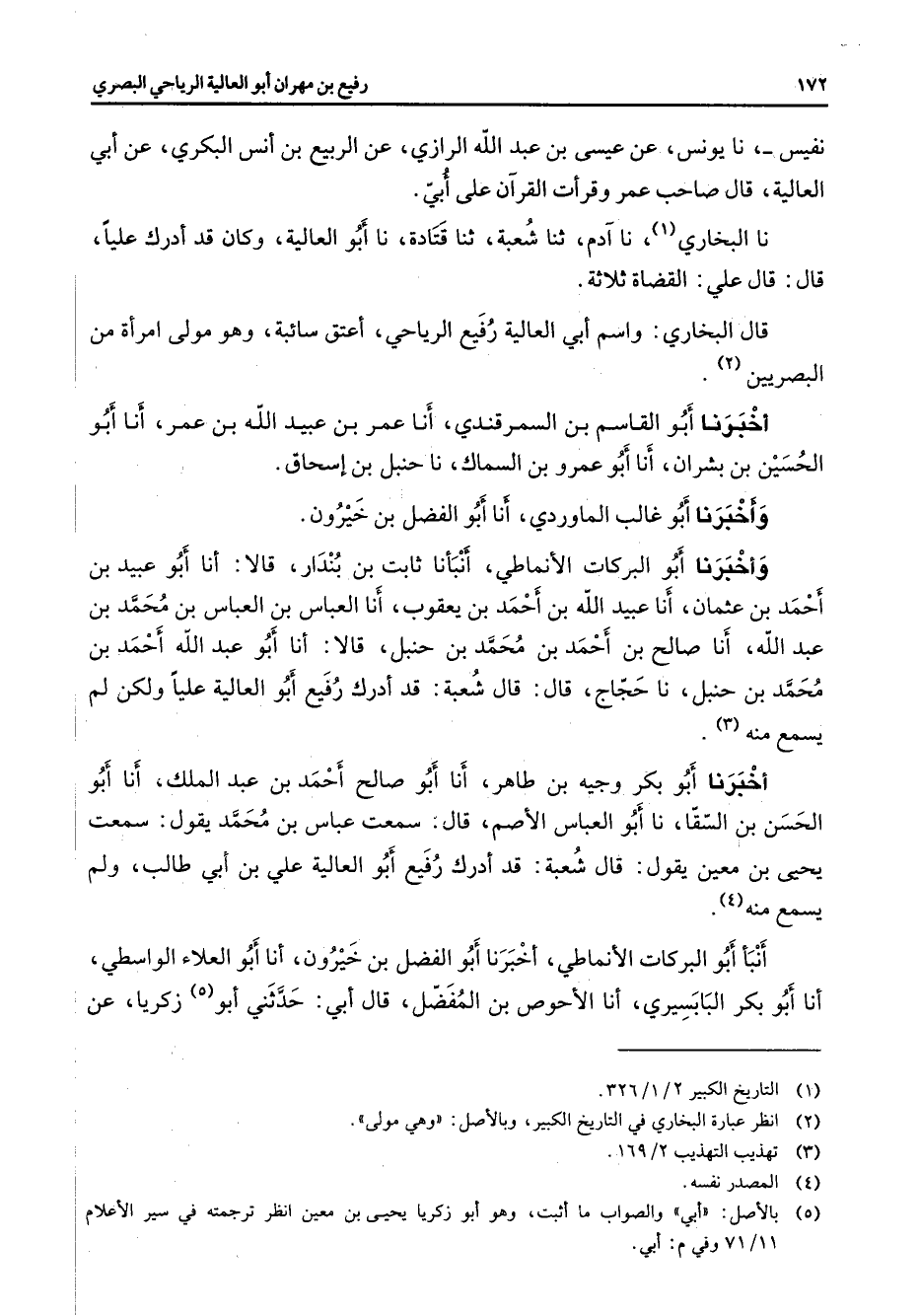 نفيس نا يونس عن عيسى بن عبد الله الرازي عن الربيع بن أنس البكري عن أبي العالية قال صاحب عمر وقرأت القرآن على أبي نا البخاري (1) نا آدم ثنا شعبة ثنا قتادة نا أبو العالية وكان قد أدرك عليا قال قال علي القضاة ثلاثة قال البخاري واسم أبي العالية رفيع الرياحي أعتق سائبة وهو مولى امرأة من البصريين (2) أخبرنا أبو القاسم بن السمرقندي أنا عمر بن عبيد الله بن عمر أنا أبو الحسين بن بشران أنا أبو عمرو بن السماك نا حنبل بن إسحاق وأخبرنا أبو غالب الماوردي أنا أبو الفضل بن خيرون وأخبرنا أبو البركات الأنماطي أنبأنا ثابت بن بندار قالا أنات أبو عبيد بن أحمد بن عثمان أنا عبيد الله بن أحمد بن يعقوب أنا العباس بن العباس بن محمد بن عبد الله أنا صالح بنأحمد بن محمد بن حنبل قالا أنا أبو عبد الله أحمد بن محمد بن حنبل قال قال شعبة قد أدرك رفيع أبو العالية عليا ولكن لم يسمع منه (3) أخبرنا أبو بكر وجيه بن طاهر أنا أبو صالح أحمد بن عبد الملك أنا أبو الحسن بن السقا نا أبو العباس الأصم قال سمعت عباس بن محمد يقول سمعت يحيى بن معين يقول قال شعبة قد أدرك رفيع أبو العالية علي بن أبي طالب ولم يسمع منه (4) أنبأ أبو البركات الأنماطي أخبرنا أبو الفضل بن خيرون أنا أبو العلاء الواسطي أنا أبو بكر البابسيري أنا الأحوص بن المفضل قال أبي حدثني أبو (5) زكريا عن