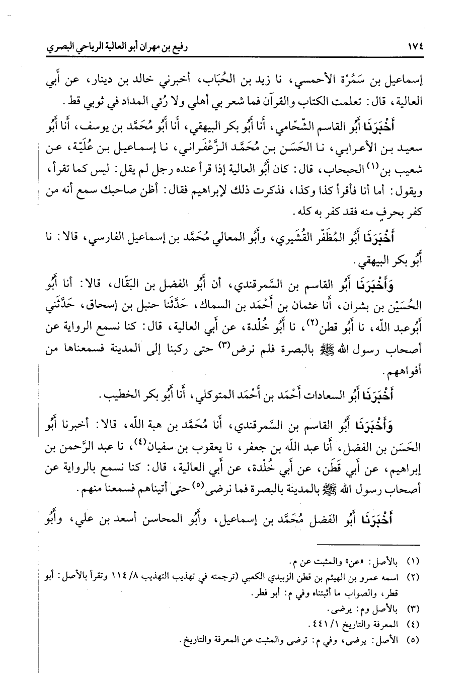 إسماعيل بن سمرة الأحمسي نا زيد بن الحباب أخبرني خالد بن دينار عن أبي العالية قال تعلمت الكتاب والقرآن فما شعر بي أهلي ولا رئي المداد في ثوبي قط أخبرنا أبو القاسم الشحامي أنا أبو بكر البيهقي أنا أبو محمد بن يوسف أنا أبو سعيد بن الأعرابي نا الحسن بن محمد الزعفراني نا إسماعيل بن علية عن شعيب بن (1) الحبحاب قال كان أبو العالية إذا قرأ عنده رجل لم يقل ليس كما تقرأ ويقول أما أنا فأقرأكذا وكذا فذكرت ذلك لإبراهيم فقال أظن صاحبك سمع أنه من كفر بحرف منه فقد كفر به كله أخبرنا أبو المظفر القشيري وأبو المعالي محمد بن إسماعيل الفارسي قالا نا أبو بكر البيهقي وأخبرنا أبو القاسم بن السمرقندي أن أبو الفضل بن البقال قالا أنا أبو الحسين بن بشران أنا عثمان بن أحمد بن السماك حدثنا حنبل بن إسحاق حدثني أبو عبد الله نا أبو قطن (2) نا أبو خلدة عن أبي العالية قال كنا نسمع الرواية عن أصحاب رسول الله (صلى الله عليه وسلم) بالبصرة فلم نرض (3) حتى ركبنا إلى المدينة فسمعناها من أفواههم أخبرنا أبو السعادات أحمد بن أحمد المتوكلي أنا أبو بكر الخطيب وأخبرنا أبو القاسم بن السمرقندي أنا محمد بن هبة الله قالا أخبرنا أبو الحسن بن الفضل أنا عبد الله بن جعفر نا يعقوب بن سفيان (4) نا عبد الرحمن بن إبراهيم عنأبي قطن عن أبي خلدة عن أبي العالية قال كنا نسمع بالرواة عن أصحاب رسول الله (صلى الله عليه وسلم) بالمدينة بالبصرة فما نرضى (5) حتى أتيناهم فسمعنا منهم أخبرنا أبو الفضل محمد بن إسماعيل وأبو المحاسن أسعد بن علي وأبو