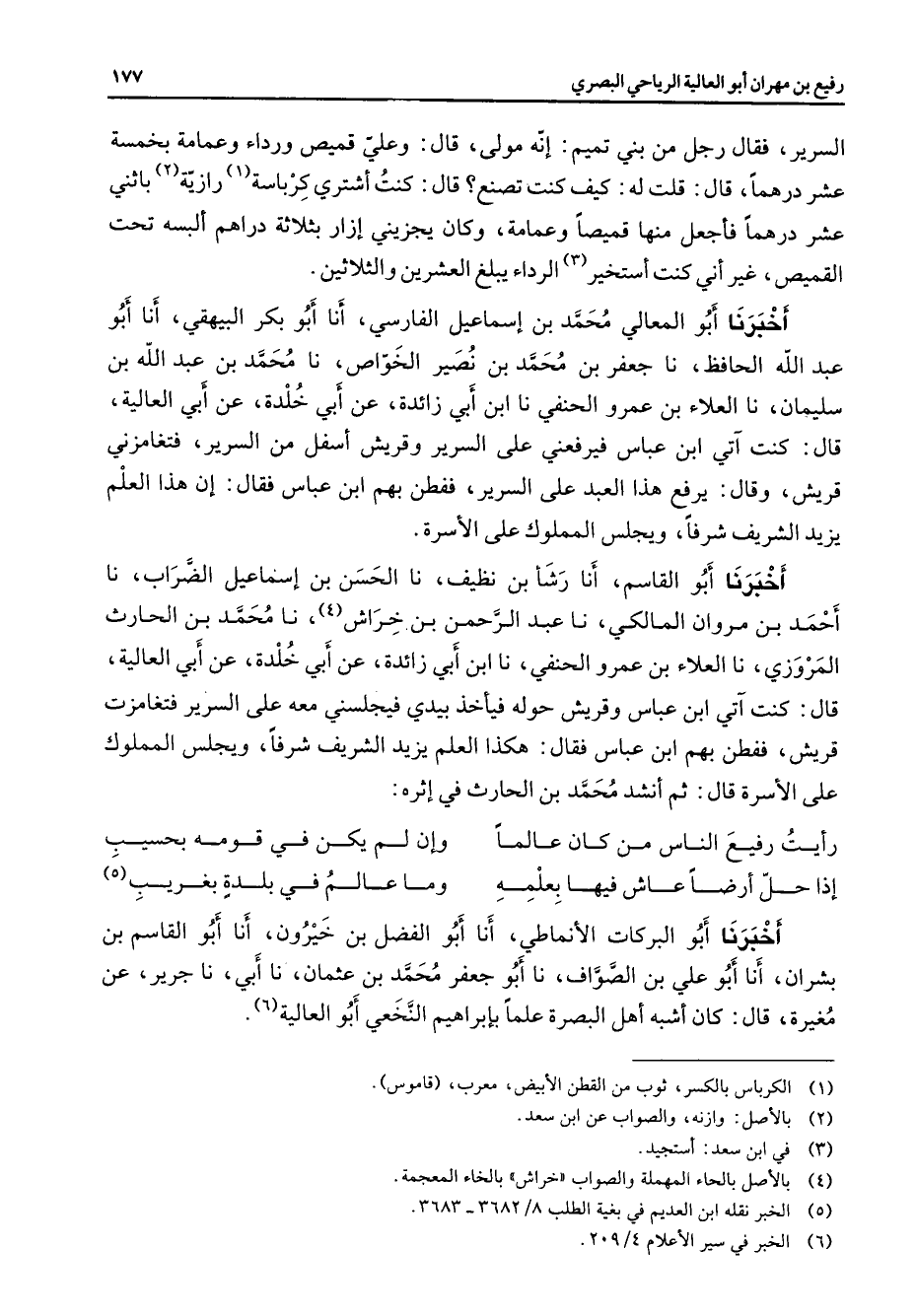 السرير فقال رجل من بني تميم إنه مولى قال وعلي قميص ورداء وعمامة بخمسة عشر درهما قال قلت له كيف كنت تصنع قال كنت أشتري كرباسة (1) رازية (2) باثني عشر درهما فأجعل منها قميصا وعمامة وكان يجزيني إزار بثلاثة دراهم ألبسه تحت القميص غير أني كنت أستخير (3) الرداء يبلغ العشرين والثلاثين أخبرنا أبو المعالي محمد بن إسماعيل الفارسي أنا أبو بكر البيهقي أنا أبو عبد الله الحافظ نا جعفر بن محمد بن نصير الخواص نا محمد بن عبد الله بن سليمان نا العلاء بن عمرو الحنفي نا ابن أبي زائدة عن أبي خلدة عنأبي العالية قال كنت آتي ابن عباس فيرفعني على السرير وقريش أسفل من السرير فتغامزني قريش وقال يرفع هذا العبد على السرير ففطن بهم ابن عباس فقال إن هذا العلم يزيد الشريف شرفا ويجلس المملوك على الأسرة أخبرنا أبو القاسم أنا رشأبن نظيف نا الحسن بن إسماعيل الضراب أحمد بن مروان المالكي نا عبد الرحمن بن خراش (4) نا محمد بن الحارث المروزي نا العلاء بن عمرو الحنفي نا ابن أبي زائدة عنابي خلدة عنأبي العالية قال كنت آتي ابن عباس وقريش حوله فيأخذ بيدي فيجلسني معه على السرير فتغامزت قريش ففطن بهم ابن العباس فقال هكذا العلم يزيد الشريف شرفا ويجلس المملوك على الأسرة قال ثم أنشد محمد بن الحارث في إثره رأيت رفيع الناس من كان عالما * وإن لم يكن في قومه بحسيب إذا حل أرضا عاش فيها بعلمه * وما عالم في بلدة بغريب * (5) أخبرنا أبو البركات الأنماطي أنا أبو الفضل بن خيرون أنا أبو القاسم بن بشران أنا أبو علي بن الصواف نا أبو جعفر محمد بن عثمان نا أبي نا جرير عن مغيرة قال كان أشبه أهل البصرة علما بإبراهيم النخعي أبو العالية (6)
