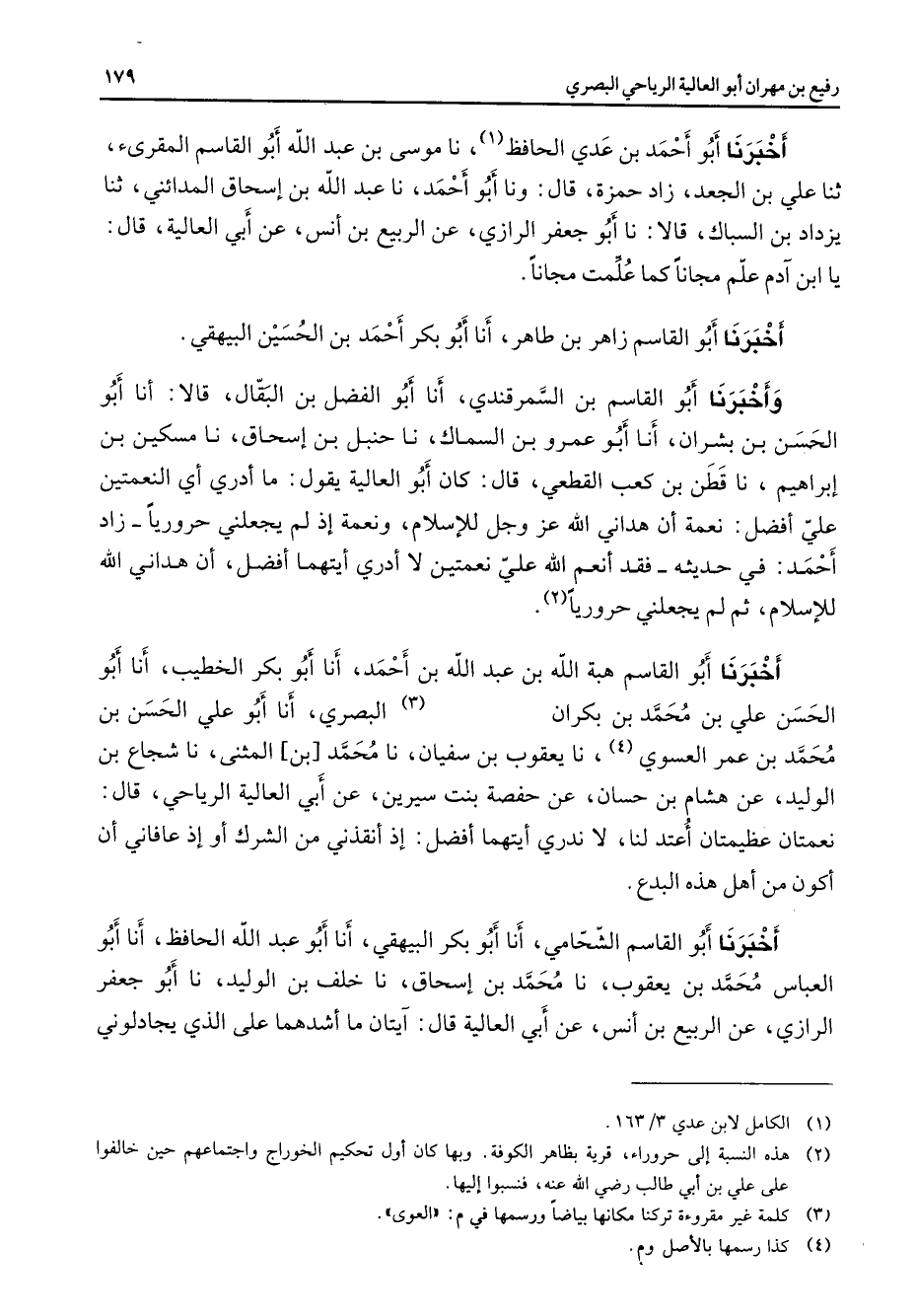 أخبرنا أبو أحمد بن عدي الحافظ () نا موسى بن عبد الله أبو القاسم المقرئ ثنا علي بن الجعد زاد حمزة قال ونا أبو أحمد نا عبد الله بن إسحاق المدائني ثنا يزداد بن السباك قالا نا أبو جعفر الرازي عن الربيع بن انس عن أبي العالية قال يا ابن آدم علم مجانا كما علمت مجانا أخبرنا أبو القاسم زاهر بن طاهر أنا أبو بكر أحمد بن الحسين البيهقي وأخبرنا أبو القاسم بن السمرقندي أنا أبو الفضل بن البقال قالا أنا أبو الحسن بن بشران أنا أبو عمرو بن السماك نا حنبل بن إسحاق نا مسكين بن إبراهيم نا قطن بن كعب القطعي قال كان أبو العالية يقول ما أدري أي النعمتين علي أفضل نعمة أن هداني الله عز وجل للإسلام ونعمة إذ لم يجعلني حروريا زاد أحمد في حديثه فقد أنعم الله علي نعمتين لا أدري أيتهما أفضل أن هداني الله للإسلام ثم لم يجعلني حروريا (2) أخبرنا أبو القاسم هبة الله بن عبد الله بن أحمد أنا أبو بكر الخطيب أنا أبو الحسن علي بن محمد بن بكران (3) البصري أنا أبو علي الحسن بن محمد بن عمر العسوي (4) نا يعقوب بن سفيان نا محمد بن المثنى نا شجاع بن الوليد عن هشام بن حسان عن حفصة بنت سيرين عنأبي العالية الرياحي قال نعمتان عظيمتان أعتد لنا لا ندري أيتهما أفضل إذ أنقذني من الشرك أو إذ عافاني أن أكون من أهل هذه البدع أخبرنا أبو القاسم الشحامي أنا أبو بكر البيهقي أنا أبو عبد الله الحافظ أنا أبو العباس محمد بن يعقوب نا محمد بن إسحاق نا خلف بن الوليد نا أبو جعفر الرازي عن الربيع بن أنس عن أبي العالية قال آيتان ما أشدهما على الذي يجادلوني