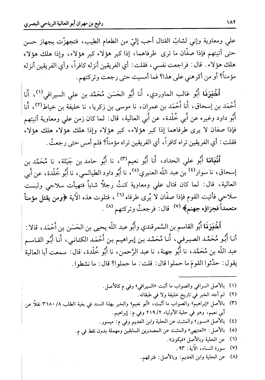 علي ومعاوية وإني لشاب القتال أحب إلي من الطعام الطيب فتجهزت بجهاز حسن حتى أتيتهم فإذا صفان ما ترى طرفاهما إذا كبر هؤلاء كبر هؤلاء وإذا هلك هؤلاء هلك هؤلاء قال فراجعت نفسي فقلت أي الفريقين أنزله كافرا وأي الفريقين أنزله مؤمنا أو من أكرهني على هذا فما أمسيت حتى رجعت وتركتهم أخبرنا أبو غالب الماوردي أنا أبو الحسن محمد بن علي السيرافي (1) أنا أحمد بن إسحاق أنا أحمد بن عمران نا موسى بن زكريا نا خليفة بن خياط (2) أنا أبو داود وغيره عنأبي خلدة عن أبي العالية قال لما كان زمن علي ومعاوية أتيتهم فإذا صفان لا يرى طرفاهما إذا كبر هؤلاء كبر هؤلاء وإذا هلك هؤلاء هلك هؤلاء فقلت أي الفريقين تراه كافرا أي الفريقين تراه مؤمنا فلم أمس حتى رجعت أنبأنا أبو علي الحداد أنا أبو نعيم (3) نا أبو حامد بن جبلة نا محمد بن إسحاق نا سوار (4) بن عبد الله العنبري (5) نا أبو داود الطيالسي نا أبو خلدة عنو أبي العالية قال لما كان قتال علي ومعاوية كنت رجلا شابا فتهيأت سلاحي ولبست سلاحي فأتيت القوم فإذا صفان لا يرى طرفاه (6) فتلوت هذه الآية " ومن يقتل مؤمنا متعمدا فجزاؤه جهنم " (7) قال فرجعت وتركتهم (8) أخبرنا أبو القاسم بن السمرقندي وأبو عبد الله يحيى بن الحسن بن أحمد قالا أنا أبو محمد الصيرفي أنا محمد بن إبراهيم بن أحمد الكتاني أنا أبو القاسم عبد الله بن محمد نا أبو جهينة نا عبد الرحمن نا أبو خلدة قال سمعت أبا العالي يقول حدثوا القوم ما حملوا قال ما نشطوا
