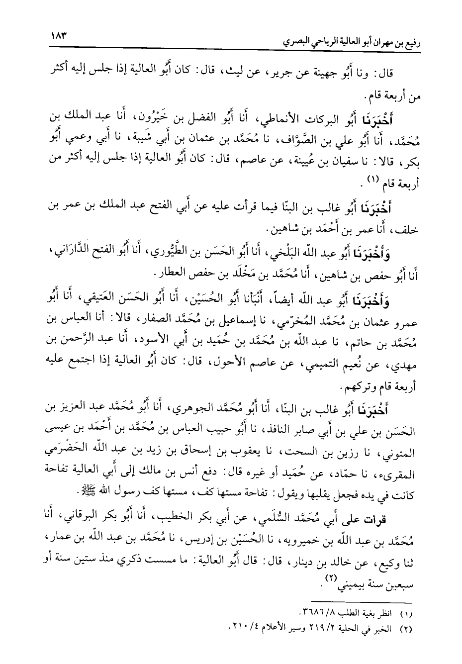 قال ونا أبو جهينة عن جرير عن ليث قال كان أبو العالية إذا جلس إليه أكثر من أربعة قام أخبرنا أبو البركات الأنماطي أنا أبو الفضل بن خيرون أنا عبد الملك بن محمد أنا أبو علي بن الصواف نا محمد بن عثمان بنأبي شيبة نا أبي وعمي أبو بكر قالا نا سفيان بن عيينة عن عاصم قال كان أبو العالية إذا جلس إليه أكثر من أربعة قام (1) أخبرنا أبو غالب بن البنا فيما قرأت عليه عن أبي الفتح عبد الملك بن عمر بن خلف أنا عمر بن أحمد بن شاهين وأخبرنا أبو عبد الله البلخي أنا أبو الحسن بن الطيوري أنا أبو الفتح الداراني أنا أبو حفص بن شاهين أنا محمد بن مخلد بن حفص العطار وأخبرنا أبو عبد الله أيضا أنبأنا أبو الحسين أنا أبو الخسن العتيقي أنا أبو عمرو عثمان بن محمد المخرمي نا إسماعيل بن محمد الصفار قالا أنا العباس بن محمد بن حاتم نا عبد الله بن محمد بن حميد بن أبي الأسود أنا عبد الرحمن بن مهدي عن نعيم التميمي عن عاصم الأحول قال كان أبو العالية إذا اجتمع عليه اربعة قام وتركهم أخبرنا أبو غالب بن البنا أنا أبو محمد الجوهري أنا أبو محمد عبد العزيز بن الحسن بن علي بن أبي صابر النافذ نا أبو حبيب العباس بن محمد بن أحمد بن عيسى المتوني نا رزين بن السحت نا يعقوب بن إسحاق بن زيد بن عبد الله الحضرمي المقرئ نا حماد عن حميد أو غيره قال دفع أنس بن مالك إلى أبي العالية تفاحة كانت في يده فجعل يقلبها ويقول تفاحة مستها كف مستها كف رسول الله (صلى الله عليه وسلم) قرأت على أبي محمد السلمي عن أبي بكر الخطيب أنا أبو بكر البرقاني أنا محمد بن عبد الله بن خميرويه نا الحسين بن إدريس نا محمد بن عبد الله بن عمار ثنا وكيع عن خالد بن دينار قال قال أبو العالية ما مسست ذكري منذ ستين سنة أو سبعين سنة بيميني (2)