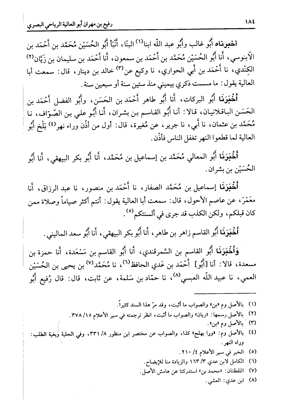أخبرناه أبو غالب وأبو عبد الله ابنا (1) البنا أنبأ أبو الحسين محمد بن أحمد بن الآبنوسي أنا أبو الحسين محمد بن أحمد بن سمعون أنا أحمد بن سليمان بن زيان (2) الكندي نا أحمد بن أبي الحواري نا وكيع عن (3) خالد بن دينار قال سمعت أبا العالية يقول ما مسست ذكري بيميني منذ ستين سنة أو سبعين سنة أخبرنا أبو البركات أنا أبو طاهر أحمد بن الحسن وأبو الفضل أحمد بن الحسن الباقلانيان قالا أنا أبو القاسم بن بشران أنا أبو علي بن الصواف نا محمد بن عثمان نا أبي نا جرير عن مغيرة قال أول من أذن وراء نهر (4) بلخ أبو العالية لما قطعوا النهر تغفل الناس فأذن أخبرنا أبو المعالي محمد بن إسماعيل بن محمد أنا أبو بكر البيهقي أنا أبو الحسين بن بشران أخبرنا إسماعيل بن محمد الصفار نا أحمد بن منصور نا عبد الرزاق أنا معمر عن عاصم الأحول قال سمعت أبا العالية يقول أنتم أكثر صياما وصلاة ممن كان قبلكم ولكن الكذب قد جرى في ألسنتكم (5) أخبرنا أبو القاسم زاهر بن طاهر أنا أبو بكر البيهقي أنا أبو سعد الماليني وأخبرنا أبو القاسم بن السمرقندي أنا أبو القاسم بن مسعدة أنا حمزة بن مسعدة قالا أنا أبو أحمد بن عدي الحافظ (6) نا محمد (7) بن يحيى بن الحسين العمي نا عبيد الله العبسي (8) نا حماد بن سلمة عن ثابت قال قال رفيع أبو