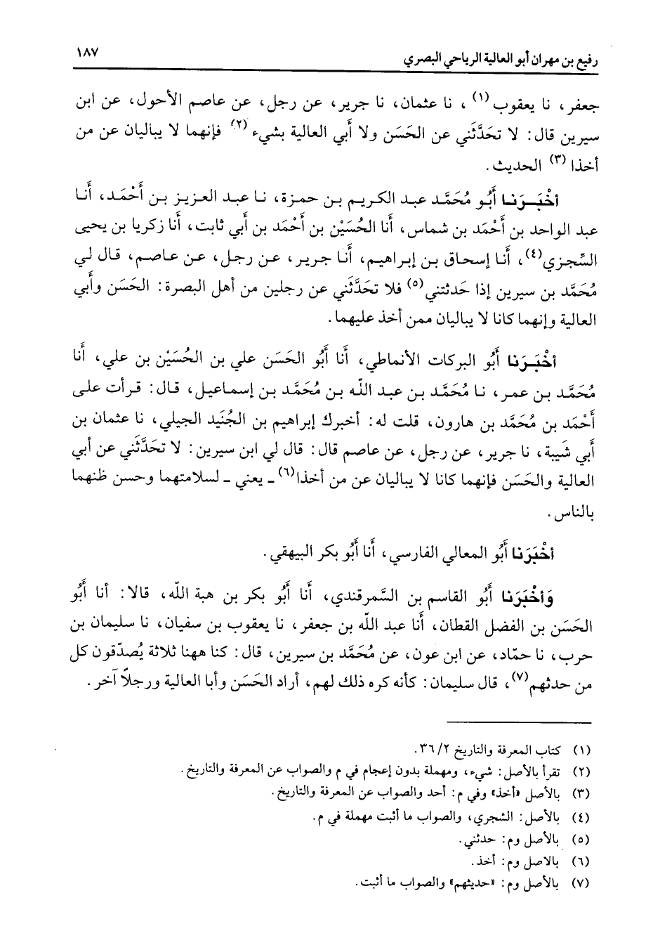 جعفر نا يعقوب (1) نا عثمان نا جرير عن رجل عن عاصم الأحول عن ابن سيرين قال لا تحدثني عن الحسن ولا أبي العالية بشئ (2) فإنهما لا يباليان عن من أخذا (3) الحديث أخبرنا أبو محمد عبد الكريم بن حمزة نا عبد العزيز بن أحمد أنا عبد الواحد بن أحمد بن شماس أنا الحسين بن أحمد بن أبي ثابت أنا زكريا بن يحيى السجري (4) أنا إسحاق بن إبراهيم أنا جرير عن رجل عن عاصم قال لي محمد بن سيرين إذا حدثتني فلا تحدثني عن رجلين من أهل البصرة الحسن وأبي العالية وإنهما كانا لا يباليان ممن أخذ عليهما أخبرنا أبو البركات الأنماطي أنا أبو الحسن علي بن الحسين بن علي أنا محمد بن عمر نا محمد بن عبد الله بن محمد بن إسماعيل قال قرأت على أحمد بن محمد بن هارون قلت له أخبرك إبراهيم بن الجنيد الجيلي نا عثمان بن أبي شيبة نا جرير عن رجل عن عاصم قال قال لي ابن سيرين لا تحدثني عن أبي العالية والحسن فإنهما كانا لا يباليان عن من أخذا (6) يعني لسلامتهما وحسن ظنهما بالناس أخبرنا أبو المعالي الفارسي أنا أبو بكر البيهقي وأخبرنا أبو القاسم بن السمرقندي أنا أبو بكر بن هبة الله قالا أنا أبو الحسن بن الفضل القطان أنا عبد الله بن جعفر نا يعقوب بن سفيان نا سليمان بن حرب نا حماد عن ابن عون عن محمد بن سيرين قال كنا ههنا ثلاثة يصدقون كل من حدثهم (7) قال سليمان كأنه كره ذلك لهم أراد الحسن وأبا العالية ورجلا آخر