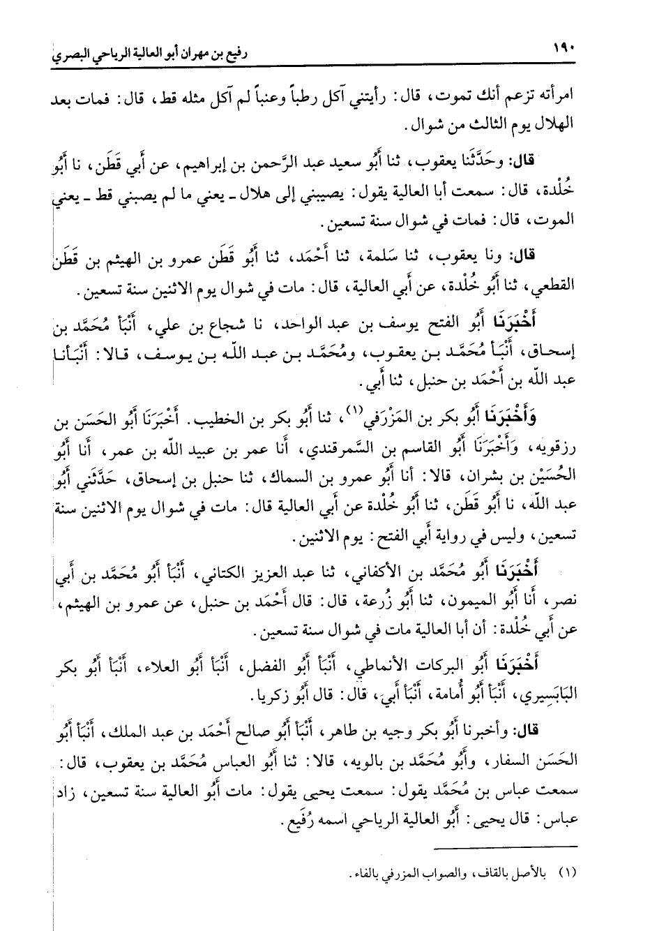 امرأته تزعم أنك تموت قال رأيتني آكل رطبا وعنبا لم آكل مثله قط قال فمات بعد الهلال يوم الثالث من شوال قال وحدثنا يعقوب ثنا أبو سعيد عبد الرحمن بن إبراهيم عن أبي قطن نا أبو خلدة قال سمعت أبا العالية يقول يصيبني إلى هلال يعني ما لم يصبني قط يعني الموت قال فمات في شوال سنة تسعين قال ونا يعقوب ثنا سلمة ثنا أحمد أبو قطن عمرو بن الهيثم بن قطن القطعي ثنا أبو خلدة عن أبي العالية قال مات في شوال يوم الاثنين سنة تسعين أخبرنا أبو الفتح يوسف بن عبد الواحد نا شجاع بن علي أنبأ محمد بن إسحاق أنبأ محمد بن يعقوب ومحمد بن عبد الله بن يوسف قالا أنبأنا عبد الله بن أحمد بن حنبل ثنا أبي وأخبرنا أبو بكر بن المزرفي (1) ثنا أبو بكر بن الخطيب أخبرنا أبو الحسن بن رزقويه وأخبرنا أبو القاسم بن السمرقندي أنا عمر بن عبيد الله بن عمر أنا أبو الحسين بن بشران قالا أنا أبو عمرو بن السماك ثنا حنبل بن إسحاق حدثني أبو عبد الله نا أبو قطن ثنا أبو خلدة عن أبي العالية قال مات في شوال يوم الاثنين سنة تسعين وليس في رواية أبي الفتح يوم الاثنين أخبرنا أبو محمد بن الأكفاني ثنا عبد العزيز الكتاني أنبأ أبو محمد بن أبي نصر أنا أبو الميمون ثنا أبو زرعة قال قال أحمد بن حنبل عن عمرو بن الهيثم عن أبي خلدة أن أبا العالية مات في شوال سنة تسعين أخبرنا أبو البركات الأنماطي أنبأ أبو الفضل أنبأ أبو العلاء أنبأ أبو بكر البابسيري أنبأ أبو أمامة أنبأأبي قال قال أبو زكريا قال وأخبرنا أبو بكر وجيه بن طاهر أنبأ أبو صالح أحمد بن عبد الملك أنبأ أبو الحسن السفار وأبو محمد بن بالويه قالا ثنا أبو العباس محمد بن يعقوب قال سمعت عباس بن محمد يقول سمعت يحيى يقول مات أبو العالية سنة تسعين زاد عباس قال يحيى أبو العالية الرياحي اسمه رفيع