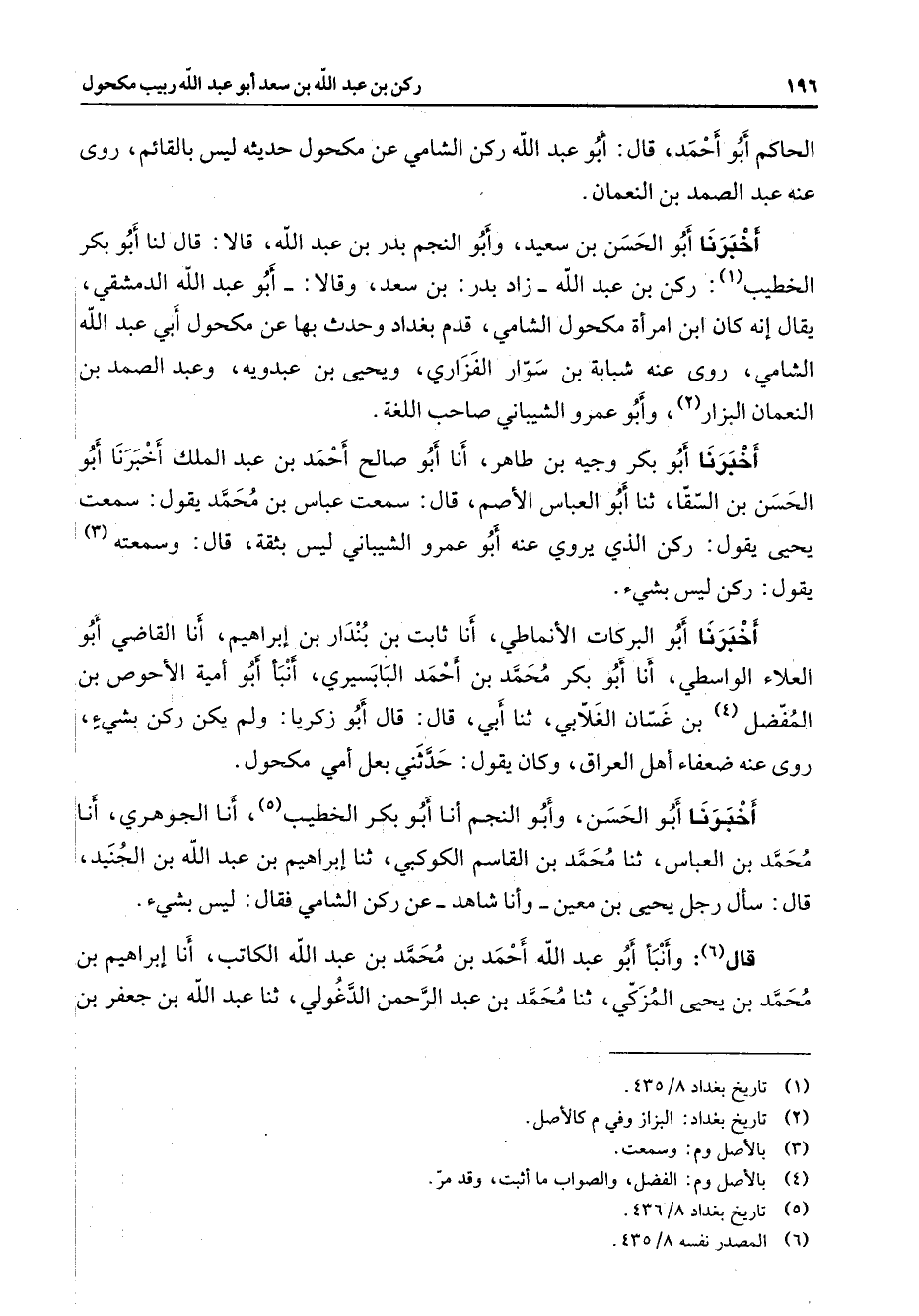 الحاكم أبو أحمد قال أبو عبد الله ركن الشامي عن مكحول حديثه ليس بالقائم روى عنه عبد الصمد بن النعمان أخبرنا أبو الحسن بن سعيد وأبو النجم بدر بن عبد الله قالا قال لنا أبو بكر الخطيب (1) ركن بن عبد الله زاد بدر بن سعد وقالا أبو عبد الله الدمشقي يقال إنه كان ابن أمرأة مكحول الشامي قدم بغداد وحدث بها عن مكحول أبي عبد الله الشامي روى عنه شبابة بن سوار الفزاري ويحيى بن عبدويه وعبد الصمد بن النعمان البزار (2) وأبو عمرو الشيباني صاحب اللغة أخبرنا أبو بكر وجيه بن طاهر أنا أبو صالح أحمد بن عبد الملك أخبرنا أبو الحسن بن السقا ثنا أبو العباس الأصم قال سمعت عباس بن محمد يقول سمعت يحيى يقول ركن الذي يروي عنه أبو عمرو الشيباني ليس بثقة قال وسمعته (3) يقول ركن ليس بشئ أخبرنا أبو البركات الأنماطي أنا ثابت بن بندار بن إبراهيم أنا القاضي أبو العلاء الواسطي أنا أبو بكر محمد بن أحمد البابسيري أنبأ أبو أمية الأحوص بن المفضل بن غسان الغلابي ثنا أبي قال قال أبو زكريا ولم يكن ركن بشئ روى عنه ضعفاء أهل العراق وكان يقول حدثني بعل أمي مكحول أخبرنا أبو الحسن وأبو النجم أنا أبو بكر الخطيب (5) أنا الجوهري أنا محمد بن العباس ثنا محمد بن القاسم الكوكبي ثنا إبراهيم بن عبد الله بن الجنيد قال سأل رجل يحيى بن معين وأنا شاهد عن ركن الشامي فقال ليس بشئ قال (6) وأنبأ أبو عبد الله أحمد بن محمد بن عبد الله الكاتب أنا إبراهيم بن محمد بن يحيى المزكي ثنا محمد بن عبد الرحمن الدغولي ثنا عبد الله بن جعفر بن