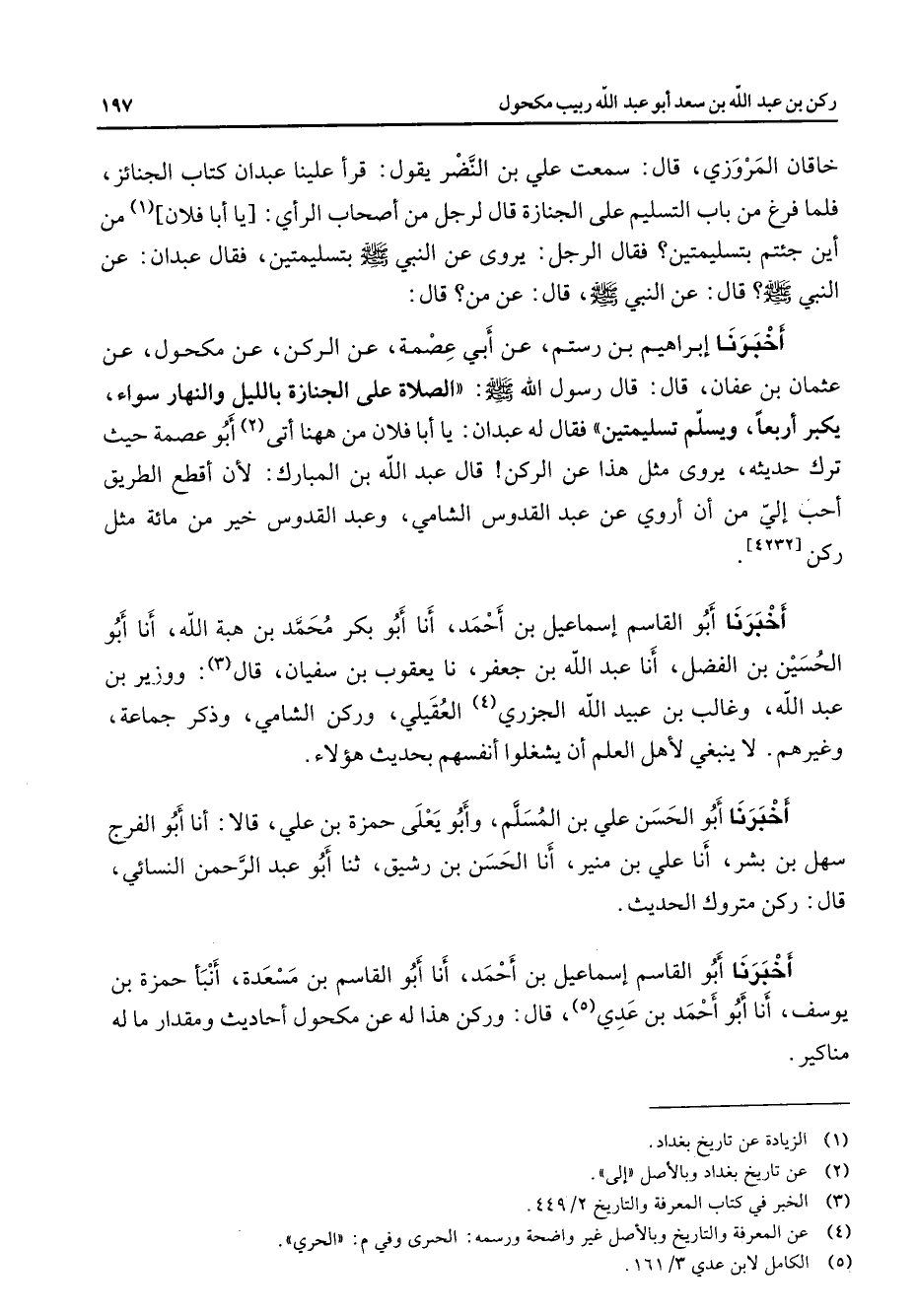 خاقان المروزي قال سمعت علي بن النضر يقول قرأ علينا عبدان كتاب الجنائز فلما فرغ من باب التسليم على الجنازة قال لرجل من أصحاب الرأي يا أبا فلان (1) من أين جئتم بتسليمتين فقال الرجل يروى عن النبي (صلى الله عليه وسلم) بتسليمتين فقال عبدان عن النبي (صلى الله عليه وسلم) قال عن النبي (صلى الله عليه وسلم) قال عن من قال أخبرنا إبراهيم بن رستم عنابي عصمة عن الركن عن مكحول عن عثمان بن عفان قال قال رسول الله ص الصلاة على الجنازة بالليل والنهار سواء يكبر أربعا ويسلم تسليمتين فقال له عبدان يا أبا فلان من ههنا أتى (2) أبو عصمة حيث ترك حديثه يروى مثل هذا عن الركن قال عبد الله بن المبارك لأن أقطع الطريق أحب إلي من أن أروي عن عبد القدوس الشامي وعبد القدوس خير من مائة مثل ركن أخبرنا أبو القاسم إسماعيل بن أحمد أنا أبو بكر محمد بن هبة الله أنا أبو الحسين بن الفضل أنا عبد الله بن جعفر نا يعقوب بن سفيان قال (3) ووزير بن عبد الله وغالب بن عبيد الله الجزري (4) العقيلي وركن الشامي وذكر جماعة وغيرهم لا ينبغي لأهل العلم أن يشغلوا أنفسهم بحديث هؤلاء أخبرنا أبو الحسن علي بن المسلم وأبو يعلى حمزة بن علي قالا أنا أبو الفرج سهل بن بشر أنا علي بن منير أنا الحسن بن رشيق ثنا أبو عبد الله النسائي قال ركن متروك الحديث أخبرنا أبو القاسم إسماعيل بن أحمد أنا أبو القاسم بن مسعدة أنبأحمزة بن يوسف أنا أبو أحمد بن عدي (5) قال وركن هذا له عن مكحول أحاديث ومقدار ما له مناكير