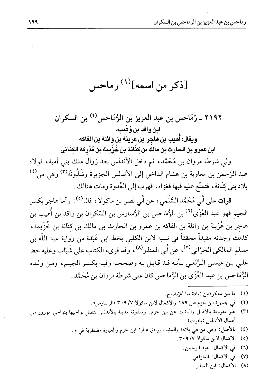 2192 - رماحس بن عبد العزيز بن الرماحس (2) بن السكران ابن واقد بن وهيب ويقال أهيب بن هاجر بن عرينة بن وائلة بن الفاكه ابن عمرو بن الحارث بن مالك بن كنانة بن خزيمة بن مدركة الكناني ولي شرطة مروان بن محمد ثم دخل الأندلس بعد زوال ملك بني أمية فولاه عبد الرحمن بن معاوية بن هشام الداخل إلى الأندلس الجزيرة وشذونة (3) وهي من (4) بلاد بني كنانة فتمنع عليه فيها فغزاه فهرب إلى العدوة ومات هنالك قرأت على أبي محمد السلمي عنأبي نصر بن ماكولا قال (5) وأما هاجر بكسر الجيم فهو عبد العزى (6) بن الرماحس بن الرسارس بن السكران بن واقد بن أهيب بن هاجر بن عرينة بن وائلة بن الفاكه بن عمرو بن الحارث بن مالك بن كنانة بن خزيمة كذلك وجدته مقيدا محققا في نسبه لابن الكلبي بخط ابن عبدة من رواية عبد الله بن مسلم المالكي الحراني (7) عن أبي المنذر (8) وقد قرئ الكتاب على شباب وعليه خط علي بن عيسى الربعي بأنه قد قابل به وصححه وفيه بكسر الجيم ومن ولده الرماحس بن عبد العزى بن الرماحس كان على شرطة مروان بن محمد