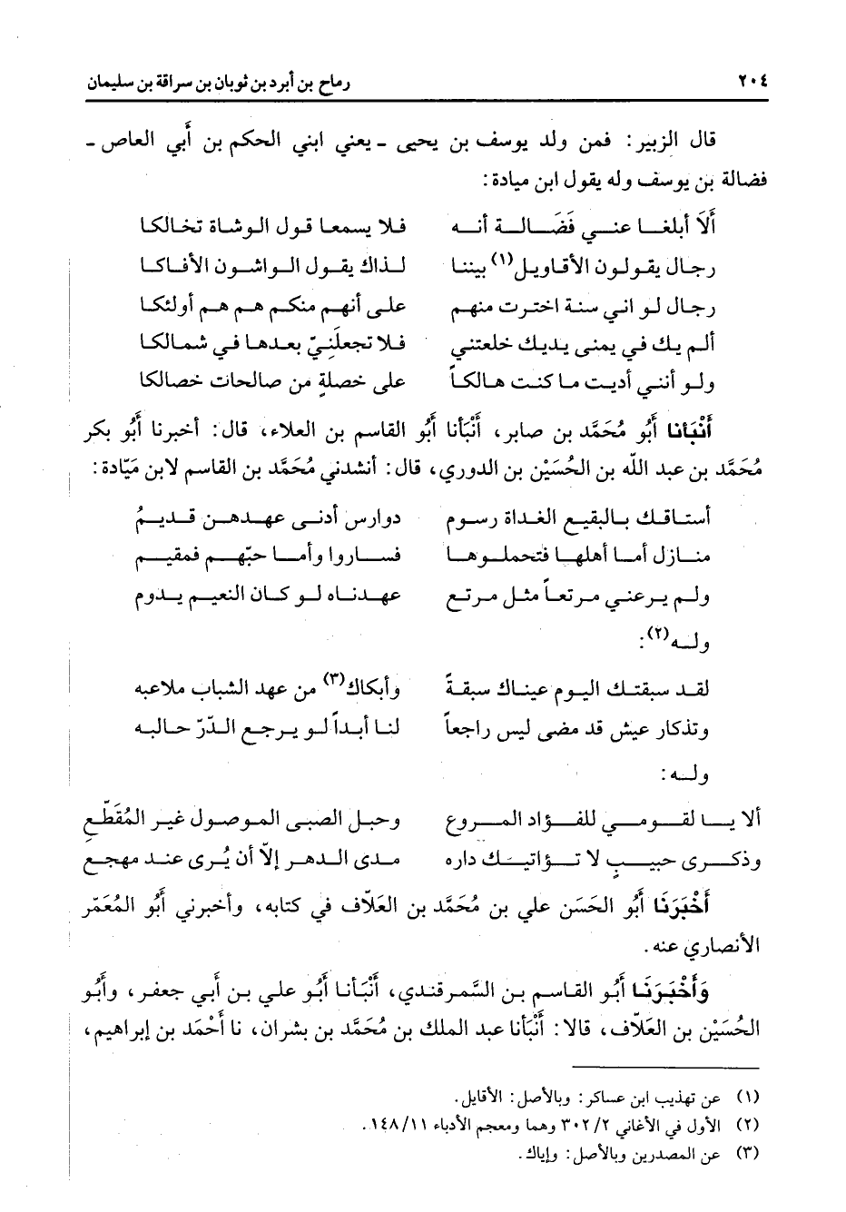 قال الزبير فمن ولد يوسف بن يحيى يعني ابني الحكم بن أبي العاص فضالة بن يوسف وله يقول ابن ميادة ألا أبلغا عني فضالة أنه * فلا سميعا قول الوشاة تخالكا رجال يقولون الأقاويل (1) بيننا * لذاك يقول الواشون الأفاكا رجال لو أني سنة اخترت منهم * على أنهم منكم هم هم أولئكا ألم يك في يمنى يديك خلعتني * فلا تجعلني بعدها في شمالكا ولو أنني أديت ما كنت هالكا * على خصلة من صالحات خصالكا * أنبأنا أبو محمد بن صابر أنبأنا أبو القاسم بن العلاء قال أخبرنا أبو بكر محمد بن عبد الله بن الحسين بن الدوري قال أنشدني محمد بن القاسم لابن ميادة أستاقك بالبقيع الغداة رسوم * دوارس أدنى عهدهن قديم منازل أما أهلها فتحملوها * فساروا وأما حبهم فمقيم ولم يرعني مرتعا مثل مرتع * عهدناه لو كان النعيم يدوم * وله (2) * لقد سبقتك اليوم عيناك سبقة * وأبكاك (3) من عهد الشباب ملاعبه وتذكار عيش قد مضى ليس راجعا * لنا أبدا لو يرجع الدر حالبه وله ألا يا لقومي للفؤاد المروع * وحبل الصبى الموصول غير المقطع وذكرى حبيب لا تؤاتيك داره * مدى الدهر إلا أن يرى عند مهجع * أخبرنا أبو الحسن علي بن محمد بن العلاف في كتابه وأخبرني أبو المعمر الأنصاري عنه وأخبرنا أبو القاسم بن السمرقندي أنبأنا أبو علي بن أبي جعفر وأبو الحسين بن العلاف قالا أنبأنا عبد الملك بن محمد بن بشران نا أحمد بن إبراهيم
