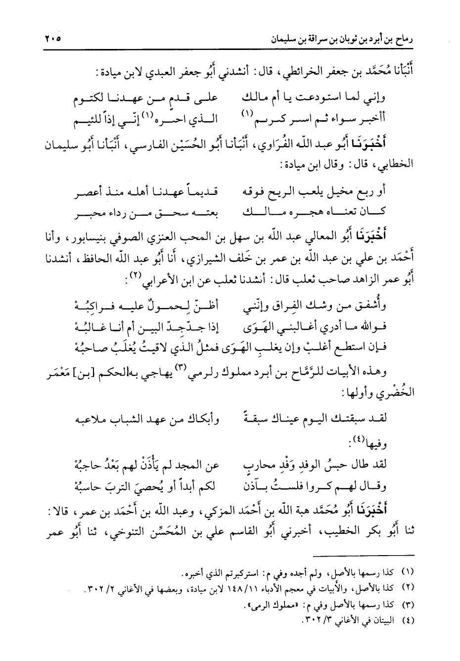 أنبأنا محمد بن جعفر الخرائطي قال أنشدني أبو جعفر العبدي لابن ميادة وإني لما استودعت يا أم مالك * على قدم من عهدنا لكتوم أأخبر سواء ثم اسر كريم (1) * الذي احسره (1) إني إذا للئيم * أخبرنا أبو عبد الله الفراوي أنبأنا أبو الحسين الفارسي أنبأنا أبو سليمان الخطابي قال وقال ابن ميادة أو ربع مخيل يلعب الريح فوقه * قديما عهدنا أهله منذ أعصر كان تعناه هجره مالك * بعته سحق من رداء محبر * أخبرنا أبو المعالي عبد الله بن سهل بن المحب العنزي الصوفي بنيسابور وأنا أحمد بن علي بن عبد الله بن عمر بن خلف الشيرازي أنا أبو عبد الله الحافظ أنشدنا أبو عمر الزاهد صاحب ثعلب قال أنشدنا ثعلب عن ابن الأعرابي (2) * وأشفق من وشك الفراق وإنني * أظن لحمول عليه فراكبه فوالله ما أدري أغالبني الهوى * إذا جدجد البين أم أنا غالبه فإن أستطع أغلب وإن يغلب الهوى * فمثل الذي لاقيت يغلب صاحبه * وهذه الأبيات للرماح بن أبرد مملوك رلرمي (3) يهاجي به الحكم بن معمر الخضري وأولها لقد سبقتك اليوم عيناك سبقه * وأبكاك من عهد الشباب ملاعبه * وفيها (4) * لقد طال حبس الوفد وفد محارب * عن المجد لم يأذن لهم بعد حاجته وقال لهم كروا فلست بآذن * لكم أبدا أو يحصي الترب حاسبه * أخبرنا أبو محمد هبة الله بنأحمد المزكي وعبد الله بن أحمد بن عمر قالا ثنا أبو بكر الخطيب أخبرني أبو القاسم علي بن المحسن التنوخي ثنا أبو عمر