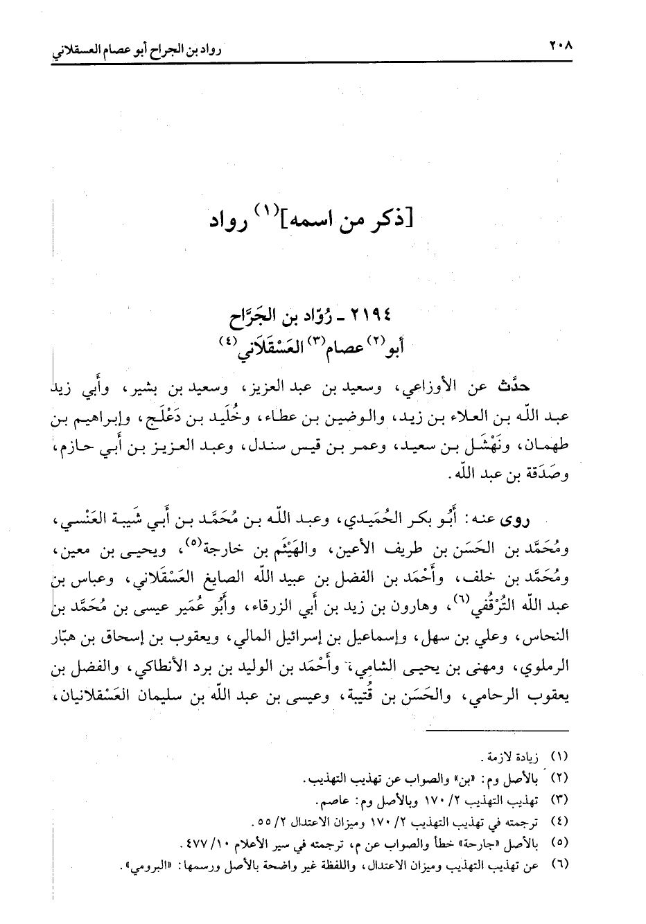 2194 - رواد بن الجراح أبو (2) عصام (3) العسقلاني (4) حدث عن الأوزاعي وسعيد بن عبد العزيز وسعيد بن بشير وأبي زيد عبد الله بن العلاء بن زيد والوضين بن عطاء وخليد بن دعلج وإبراهيم بن طهمان ونهشل بن سعيد وعمر بن قيس بن سندل وعبد العزيز بن أبي حازم وصدقة بن عبد الله روى عنه أبو بكر الحميدي وعبد الله بن محمد بنأبي شيبة العنسي ومحمد بن الحسن بن طريف الأعين والهيثم بن خارجة (5) ويحيى بن معين ومحمد بن خلف وأحمد بن الفضل بن عبيد الله الصايغ العسقلاني وعباس بن عبد الله الترقفي (6) وهارون بن زيد بنأبي الزرقاء وأبو عمير عيسى بن محمد بن النحاس وعلي بن سهل وإسماعيل بن إسرائيل المالي ويعقوب بن إسحاق بن هبار الرملوي ومهنى بن يحيى الشامي وأحمد بن الوليد بن برد الأنطاكي والفضل بن يعقوب الرحامي والحسن بن قتيبة وعيسى بن عبد الله بن سليمان العسقلانيان