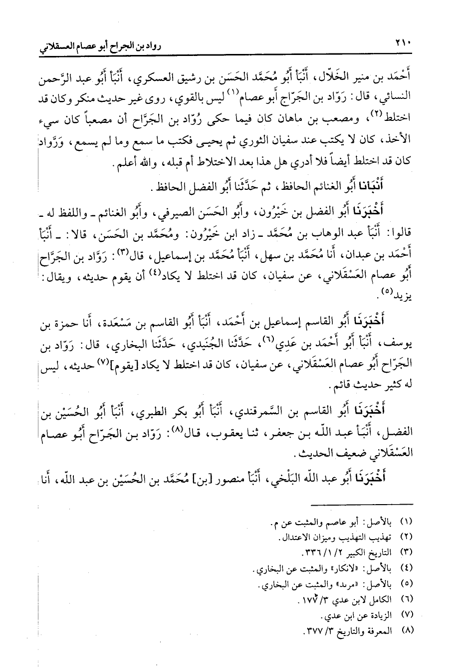 أحمد بن منير الخلال أنبأ أبو محمد الحسن بن رشيق العسكري أنبأ أبو عبد الرحمن النسائي قال رواد بن الجراج أبو عصام (1) ليس بالقوي روى غير حديث منكر وكان قد اختلط (2) ومصعب بن ماهان كان فيما حكى رواد بن الجراح أن مصعبا كان سئ الأخذ كان لا يكتب عند سفيان الثوري ثم يحيى فكتب ما سمع وما لم يسمع ورواد كان قد اختلط أيضا فلا أدري هل هذا بعد الاختلاط أم قبله والله أعلم أنبأنا أبو الغنائم الحافظ ثم حدثنا أبو الفضل الحافظ أخبرنا أبو الفضل بن خيرون وأبو الحسن الصيرفي وأبو الغنائم واللفظ له قالوا أنبأ عبد الوهاب بن محمد زاد ابن خيرون ومحمد بن الحسن قالا أنبأ أحمد بن عبدان أنا محمد بن سهل أنبأ محمد بن إسماعيل قال (3) رواد بن الجراح أبو عصام العسقلاني عن سفيان كان قد اختلط لا يكاد (4) أن يقوم حديثه ويقال يزيد (5) أخبرنا أبو القاسم إسماعيل بن أحمد أنبأ أبو القاسم بن مسعدة أنا حمزة بن يوسف أنبأ أبو أحمد بن عدي (6) حدثنا الجنيدي حدثنا البخاري قال رواد بن الجراح أبو عصام العسقلاني عن سفيان كان قد اختلط لا يكاد يقوم حديثه ليس له كثير حديث قائم أخبرنا أبو القاسم بن السمرقندي أنبأ أبو بكر الطبري أنبأ أبو الحسين بن الفضل أنبأ عبد الله بن جعفر ثنا يعقوب قال (8) رواد بن الجراح أبو عصام العسقلاني ضعيف الحديث أخبرنا أبو عبد الله البلخي أنبأ منصور بن محمد بن الحسين بن عبد الله أنا