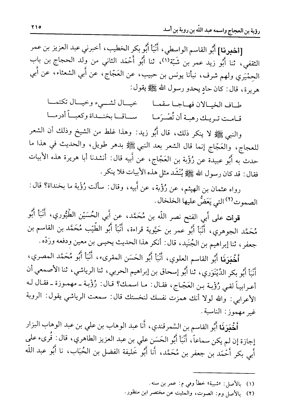 أخبرنا أبو القاسم الواسطي أنبأ أبو بكر الخطيب أخبرني عبد العزيز بن عمر الثقفي ثنا أبو زيد عمر بن شبة (1) ثنا أبو أحمد الثاني من ولد الحجاج بن باب الحميري ولهم شرف نبأنا يونس بن حبيب عن العجاج عن أبي الشعثاء عن أبي هريرة قال كان حاد يحدو رسول الله (صلى الله عليه وسلم) يقول طاف الخيالان فهاجا سقما * خيال لشئ وخيال تكتما قامت تريك رهبة أن تصرما * ساقا بخنداة وكعبا أدرما * والنبي (صلى الله عليه وسلم) لا ينكر ذلك قال أبو زيد وهذا غلط من الشيخ وذلك أن الشعر للعجاج والعجاج إنما قال الشعر بعد النبي (صلى الله عليه وسلم) بدهر طويل والحديث في هذا ما حدث به أبو عبيدة عن رؤبة بن العجاج عن أبيه قال أنشدنا أبا هريرة هذه الأبيات فقال قد كان رسول الله (صلى الله عليه وسلم) ينشد مثل هذه الأبيات فلا ينكر رواه عثمان بن الهيثم عن رؤبة عن أبيه وقال سألت رؤبة ما بخنداة قال الصموت (2) التي يعض عليها الخلخال قرأت على أبي الفتح نصر الله بن محمد عن أبي الحسين الطيوري أنبأ أبو محمد الجوهري أنبأ أبو عمر بن حيوية قراءة أنبأ أبو الطيب محمد بن القاسم بن جعفر ثنا إبراهيم بن الجنيد قال أنكر هذا الحديث يحيى بن معين ودفعه ورده أخبرنا أبو القاسم العلوي أنبأ أبو الحسن المقرئ أنبأ أبو محمد المصري انبأ أبو بكر الدينوري ثنان أبو إسحاق بن إبراهيم الحربي ثنا الرياشي ثنا الأصمعي أن أعرابيا لقي رؤبة بن العجاج فقال ما اسمك قال رؤبة مهموزة فقال له الأعرابي والله لولا أنك همزت نفسك لنخستك قال سمعت الرياشي يقول الروبة غير مهموزة الناسبة أخبرنا أبو القاسم بن السمرقندي أنا عبد الوهاب بن علي بن عبد الوهاب البزار إجازة إن لم يكن سماعا أنبأ أبو الحسن علي بن عبد العزيز الطاهري قال قرئ على أبي بكر أحمد بن جعفر بن محمد أنا أبو خليفة الفضل بن الحباب نا أبو عبد الله