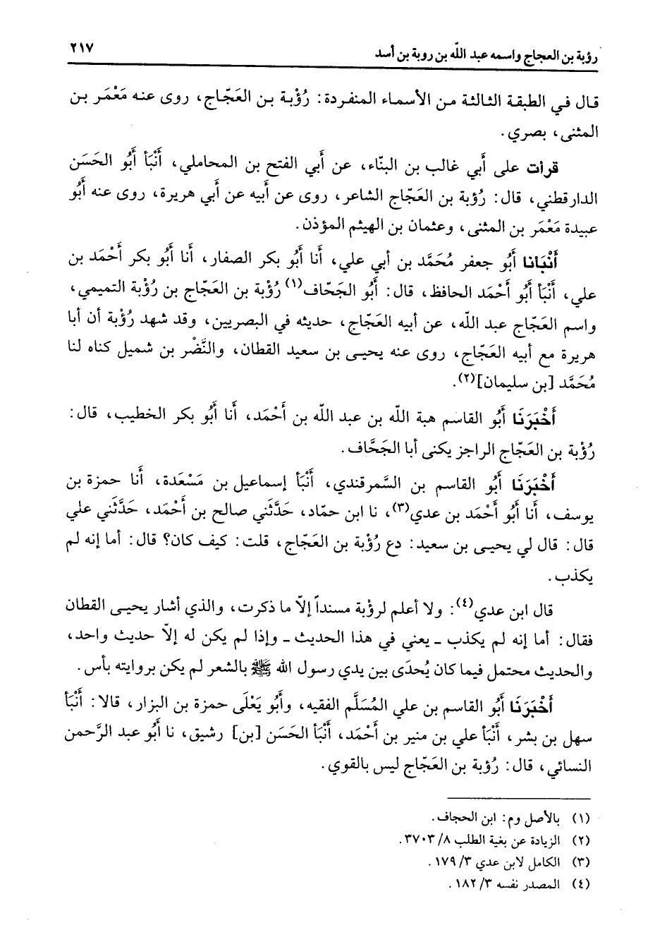 قال في الطبقة الثالثة من الأسماء المنفردة رؤبة بن العجاج روى عنه معمر بن المثنى بصري قرأت على أبي غالب بن البناء عن أبي الفتح بن المحاملي أنبأ أبو الحسن الدارقطني قال رؤبة بن العجاج الشاعر روى عن أبيه عن أبي هريرة روى عنه أبو عبيدة معمر بن المثنى وعثمان بن الهيثم المؤذن أنبأنا أبو جعفر محمد بن أبي علي أنا أبو بكر الصفار أنا أبو بكر أحمد بن علي أنبأ أبو أحمد الحافظ قال أبو الجحاف (1) رؤبة بن العجاج بن رؤبة التميمي واسم العجاج عبد الله عن أبيه العجاج حديثه في البصريين وقد شهد رؤبة أن أبا هريرة مع أبيه العجاج روى عنه يحيى بن سعيد القطان والنضر بن شميل كناه لنا محمد بن سليمان (2) أخبرنا أبو القاسم هبة الله بن عبد الله بن أحمد أنا أبو بكر الخطيب قال رؤبة بن العجاج الراجز يكنى أبا الجحاف أخبرنا أبو القاسم بن السمرقندي أنبأ إسماعيل بن مسعدة أنا حمزة بن يوسف أنا أبو أحمد بن عدي (3) نا ابن حماد حدثني صالح بن أحمد حدثني علي قال قال لي يحيى بن سعيد دع رؤبة بن العجاج قلت كيف كان قال أما إنه لم يكذب قال ابن عدي (4) ولا أعلم لرؤبة مسندا إلا ما ذكرت والذي أشار يحيى القطان فقال أما إنه لم يكذب يعني في هذا الحديث وإذا لم يكن له إلا حديث واحد والحديث محتمل فيما كان يحدى بين رسول الله (صلى الله عليه وسلم) بالشعر لم يكن بروايته بأس أخبرنا أبو القاسم بن علي المسلم الفقيه وأبو يعلى حمزة بن البزار قالا أنبأ سهل بن بشر أنبأ علي بن منير بن أحمد أنبأ الحسن بن رشيق نا أبو عبد الرحمن النسائي قال رؤبة بن العجاج ليس بالقوي