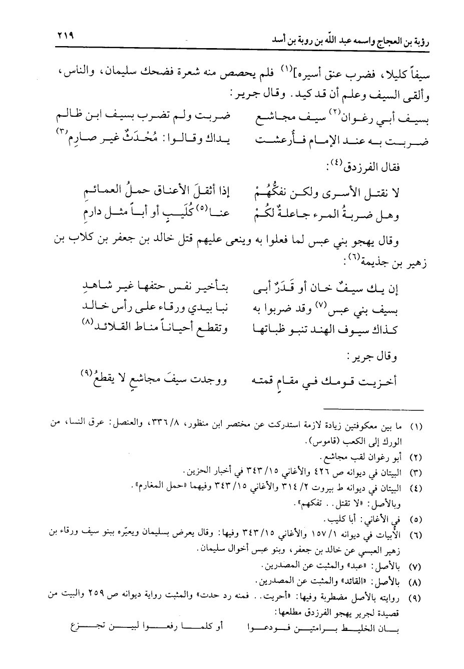 سيفا كليلا فضرب عنق أسيره (1) فلم يحصص منه شعرة فضحك سليمان والناس وألقى السيف وعلم أن قد كيد وقال جرير بسيف أبي رغوان (2) سيف مجاشع * ضربت ولم تضرب بسيف ابن ظالم ضربت به عند الإمام فأرعشت * يداك وقالوا محدث غير صارم (3) * فقال الفرزدق (4) * لا نقتل الأسرى ولكن نفكهم * إذا أثقل الأعناق حمل العمائم وهل ضربة المرء جاعلة لكم * عنا (5) كليب أو أبا مثل دارم * وقال يهجو بني عبس لما فعلوا به وينعى عليهم قتل خالد بن جعفر بن كلاب بن زهير بن جذيمة (6) * إن يك سيف خان أو قدر أبى * بتأخير نفس حتفها غير شاهد بسيف بني عبس (7) وقد ضربوا به * نبا بيدي ورقاء على رأس خالد كذاك سيوف الهند تنبو ظباتها * وتقطع أحيانا مناط القلائد (8) * وقال جرير أخزيت قومك في مقام قمته * ووجدت سيف مجاشع لا يقطع (9) *