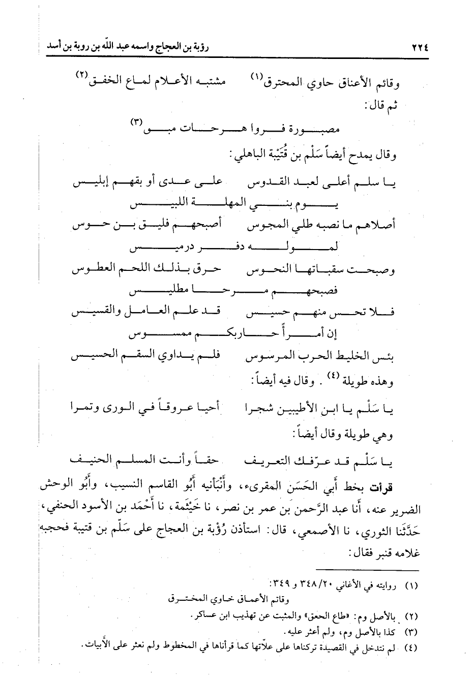 وقائم الأعناق حاوي المحترق (1) * مشتبه الأعلام لماع الخفق (2) * ثم قال * مصبورة فروا هرحات مبق (3) وقال يمدح أيضا سلم بن قتيبة الباهلي يا سلم أعلى لعبد القدوس * على عدى أو بقهم إبليس يوم بني المهلة اللبيس * أصلاهم ما نصبه طلي المجوس * أصبحهم فليق بن حوس لموله دفر درميس * وصبحت سقباتها النحوس * حرق بذلك اللحم العطوس فصبحهم مرحا مطليس * فلا تحس منهم حسيس * قد علم العامل والقسيس إن أمرأ حاربكم ممسوس * بئس الخليط الحرب المرسوس * فلم يداوي السقم الحسيس * وهذه طويلة (4) وقال فيه أيضا * يا سلم قد عرفك التعريف * حقا وأنت المسلم الحنيف * قرأت بخط أبي الحسن المقرئ وأنبأنيه أبو القاسم النسيب وأبو الوحش الضرير عنه أنا عبد الرحمن بن عمر بن نصر نا خيثمة نا أحمد بن الأسود الحنفي حدثنا الثوري نا الأصمعي قال استأذن رؤبة بن العجاج على سلم بن قتيبة فحجبه غلامه قنبر فقال