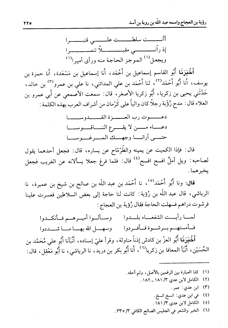 * أأنت سلطت علي قنبرا * إذ رآني مقبلا تنمرا * ويحعل (1) الموجز الحاجة منه ورأى أميرا (2) أخبرنا أبو القاسم إسماعيل بن أحمد أنا إسماعيل بن مسعدة أنا حمزة بن يوسف أنا أبو أحمد (2) ثنا أحمد بن علي المدائني نا علي بن عمرو (3) بن خالد حدثني يحيى بن زكريا أبو زكريا الأصغر قال سمعت الأصمعي عن أبي عمرو بن العلاء قال مدح رؤبة رجلا كان واليا على كرمان من أشراف العرب بهذه الكلمة دعوت رب العزة القدوسا * دعاء من لا يقرع الناقوسا * حتى أرانا وجهك المروغوسا قال فإذا الكميت عن يمينه والطرماح عن يساره قال فجعل أحدهما يقول لصاحبه ويل أمل افسح افسح (4) قال فلما فرغ جعلا يسالانه عن الغريب فجعل يخبرهما قال ونا أبو أحمد (5) نا أحمد بن عبد الله بن صالح بن شيخ بن عميرة نا الرياشي قال عبد الله بن رؤبة كانت لنا حاجة إلى بعض السلاطين فعسرت علينا فرشوت دراهم فسهلت الحاجة فقال رؤبة بن العجاج لما رأيت الشفعاء بلدوا * وسألوا أميرهم فأنكدوا فأمستهم برشوة فأفردوا * وسهل الله بها ما شددوا * أخبرنا أبو العز بن كادش إذنا مناولة وقرأ علي إسناده أنبأنا أبو علي محمد بن الحسين أنبأ المعافا بن زكريا (6) أنا أبو بكر بن دريد نا الرياشي نا أبو معقل قال