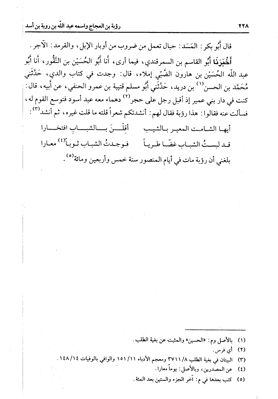 قال أبو بكر المسد حبال تعمل من ضروب من أوبار الإبل والقرمد الآجر أخبرنا أبو القاسم بن السمرقندي فيما أرى أنا أبو الحسين بن النقور أنا أبو عبد الله الحسين بن هارون الضبي إملاء قال وجدت في كتاب والدي حدثني محمد بن الحسن (1) بن دريد حدثني أبو مسلم قتيبة بن عمرو الحنفي عن أبيه قال كنت في دار بني عمير إذ أقبل رجل على حجر (2) دهماء معه عبد أسود فتوسع القوم له فسألت عنه فقالوا هذا رؤبة فقال لهم أنشدتكم شعرا قلته ما قلت غيره ثم أنشد (3) * أيها الشامت المعير بالشيب * أقلن بالشباب افتخارا قد لبست الشباب غضا طريا * فوجدت الشباب ثوبا (4) معارا * بلغني أن رؤبة مات في أيام المنصور سنة خمس وأربعين ومائة (5)