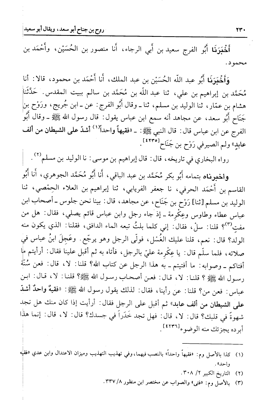 أخبرنا أبو الفرج سعيد بن أبي الرجاء أنا منصور بن الحسين وأحمد بن محمود وأخبرنا أبو عبد الله الحسين بن عبد الملك أنا أحمد بن محمود قالا أنا محمد بن إبراهيم بن علي ثنا عبد الله بن محمد بن سالم ببيت المقدس حدثنا هشام بن عمار ثنا الوليد بن مسلم ثنا وقال أبو الفرج عن ابن جريج وروح بن جناح أبو سعد عن مجاهد أنه سمع ابن عباس يقول قال رسول الله (صلى الله عليه وسلم) وقال أبو الفرج عن ابن عباس قال قال النبي (صلى الله عليه وسلم) فقيها واحدا (1) أشد على الشيطان من ألف عابد ولم الصيرفي روح بن جناح - رواه البخاري - في تاريخه قال قال إبراهيم بن موسى نا الوليد بن مسلم (2) وأخبرناه بتمامه أبو بكر محمد بن عبد الباقي أنا أبو محمد الجوهري أنا أبو القاسم بنأحمد الحرفي نا جعفر الفريابي ثنا إبراهيم بن العلاء الحمصي ثنا الوليد بن مسلم ثنا روح بن جناح عن مجاهد قال بينا نحن جلوس أصحاب ابن عباس عطاء وطاوس وعكرمة إذ جاء رجل وابن عباس قائم يصلي فقال هل من مفت قلنا سل فقال إني كلما بلت تبعه الماء الدافق فقلنا الذي يكون منه الولد قال نعم قلنا عليك الغسل فولى الرجل وهو يرجع وعجل ابن عباس في صلاته فلما سلم قال يا عكرمة علي بالرجل فأتاه به ثم أقبل علينا فقال أرأيتم ما أفتاكم وصوابه ما أفتيتم به هذا الرجل عن كتاب الله قلنا لا قال فعن سنة رسول الله (صلى الله عليه وسلم) قلنا لا قال فعن أصحاب رسول الله (صلى الله عليه وسلم) قلنا لا قال ابن عباس فعن من قلنا عن رأينا فقال لذلك يقول رسول الله (صلى الله عليه وسلم) فقيه واحد أشد على الشيطان من ألف عابد ثم أقبل على الرجل فقال أرأيت إذا كان منك هل تجد شهوة في قلبك قال لا قال فهل تجد خدرا في جسدك قال لا إنما هذا أبرده يجزئك منه الوضوءح